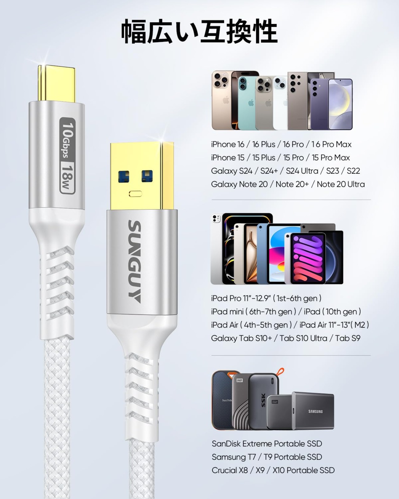 SUNGUY USB Type C ケーブル 0.3M USB3.1 Gen2 10Gbpsデータ転送 タイプ c 高速充電 USB-A to USB-C 短い 30cm 金メッキコネクタ Android Auto対応 ナイロン編み 高耐久性 iPhone17/16/15シリーズ、Galaxy S24 ultra、iPad Pro/iPad air 5その他USB-C機器対応 0.3m ホワイト