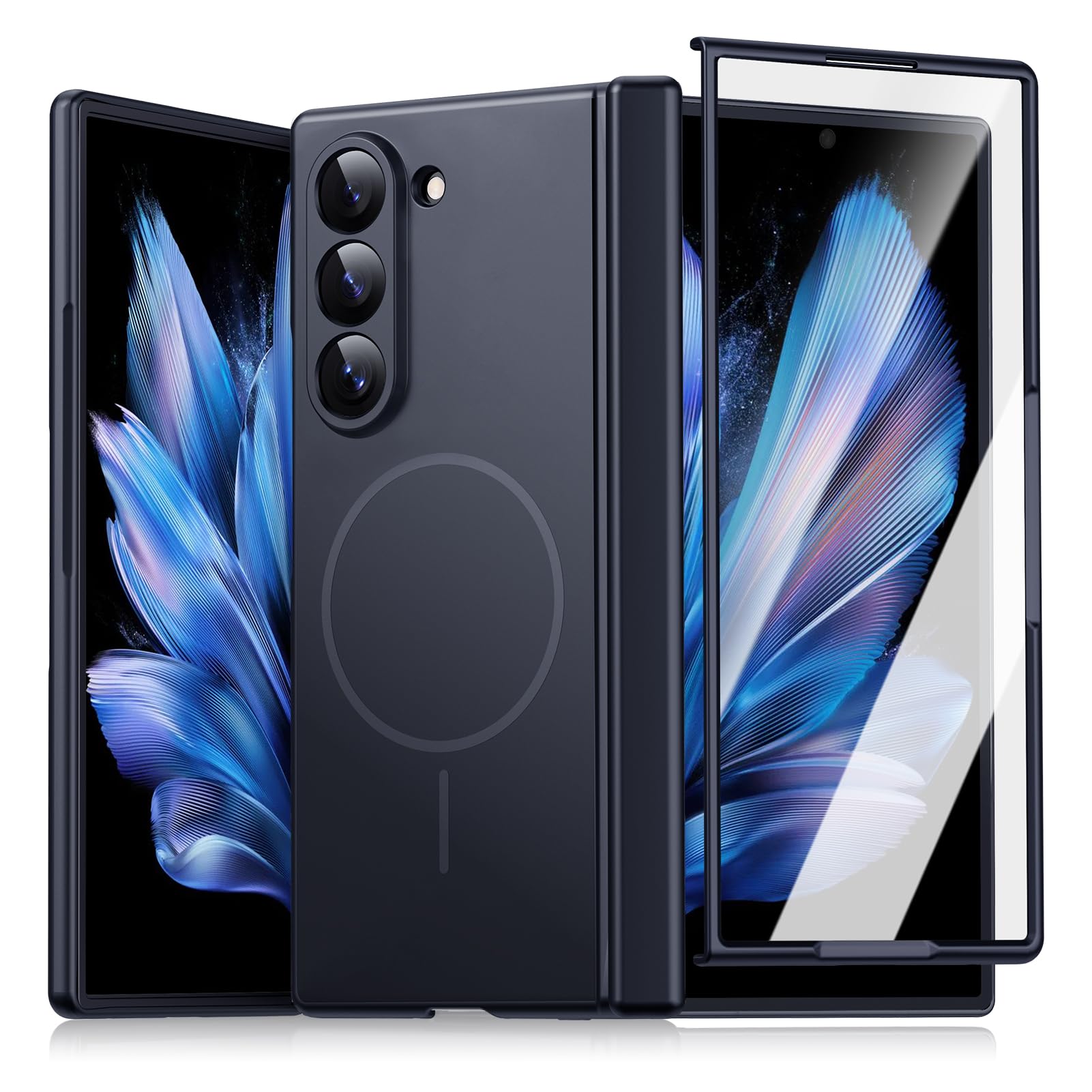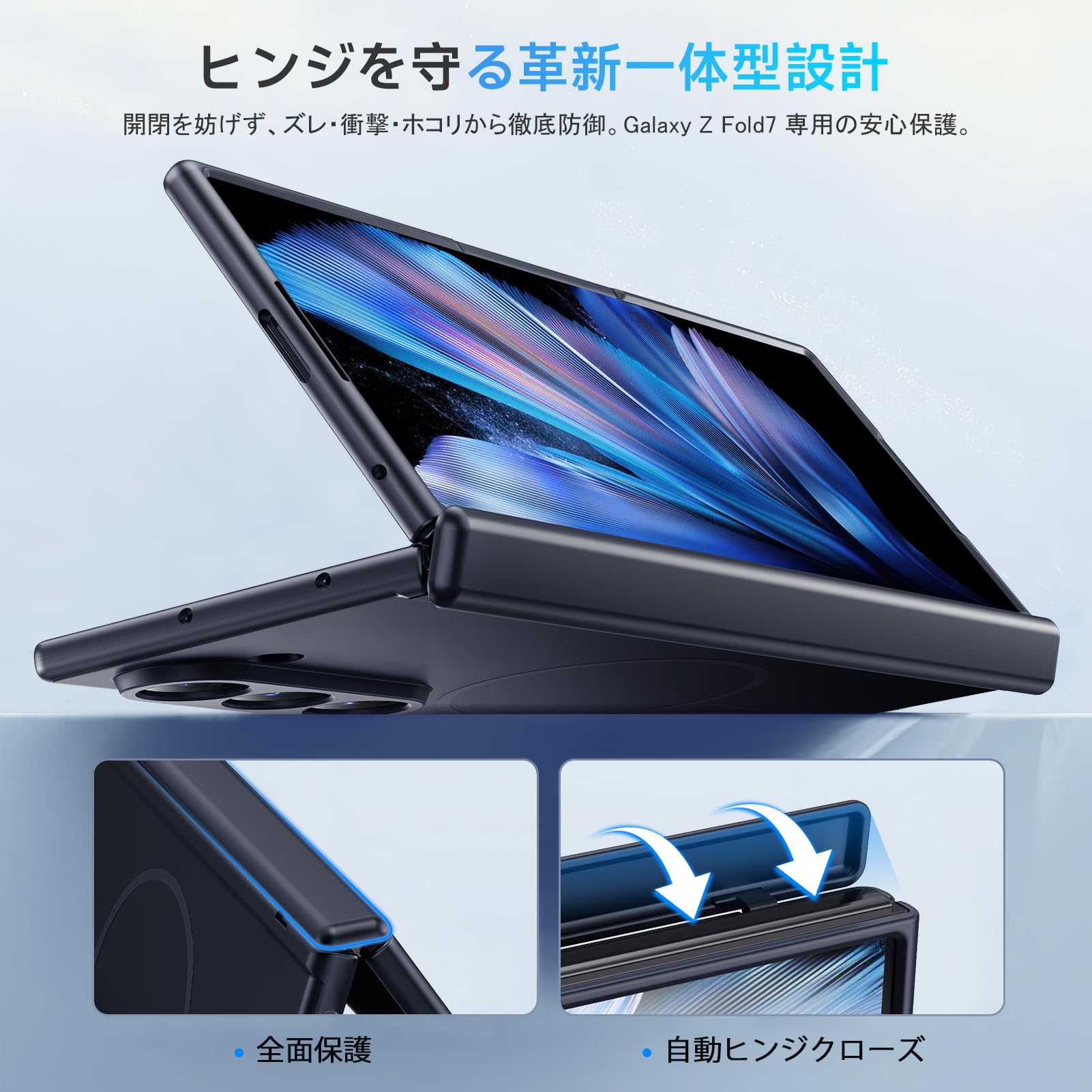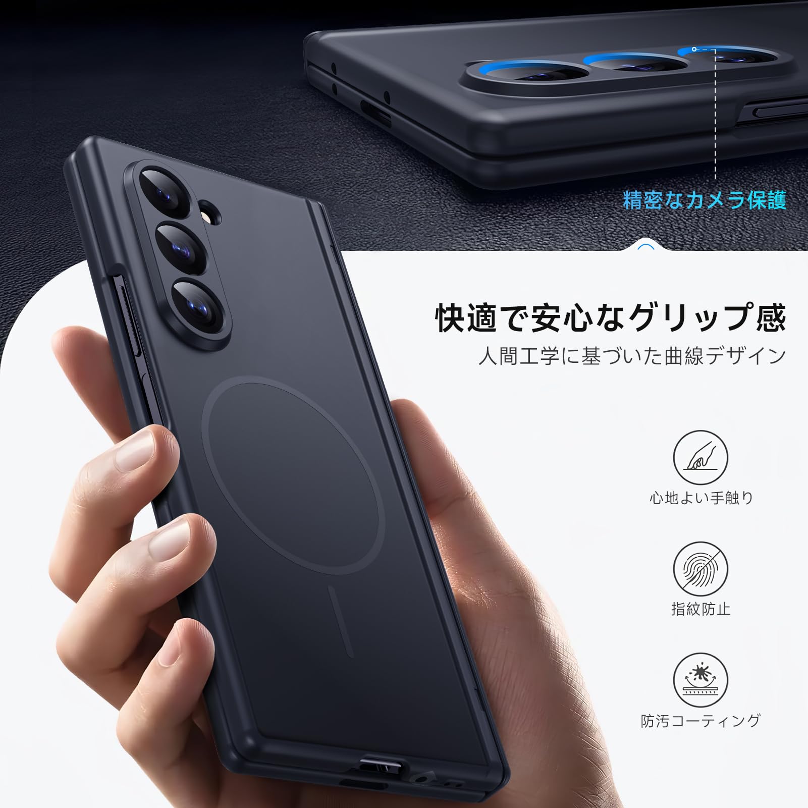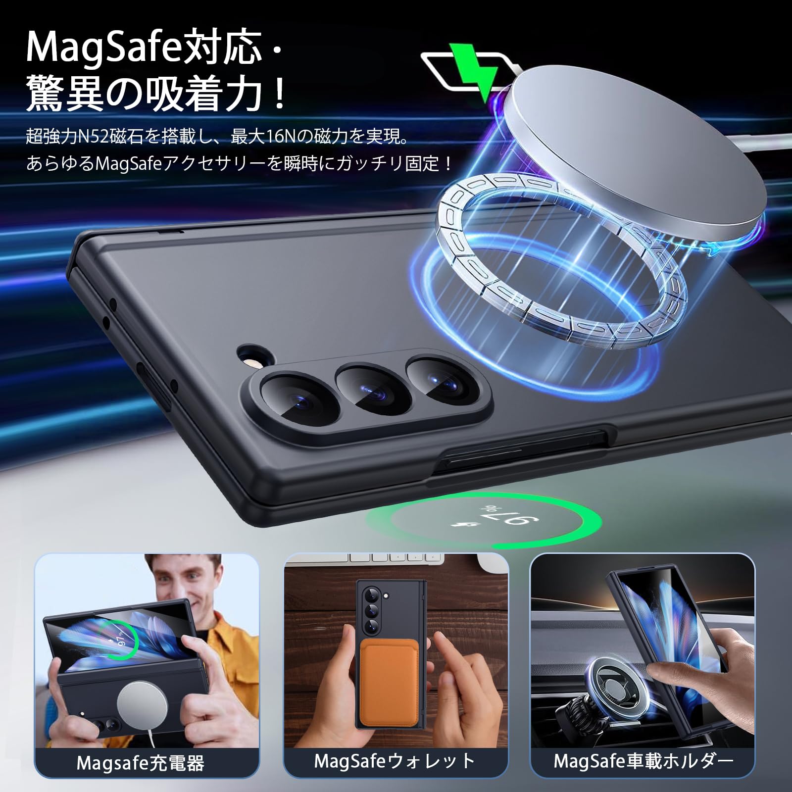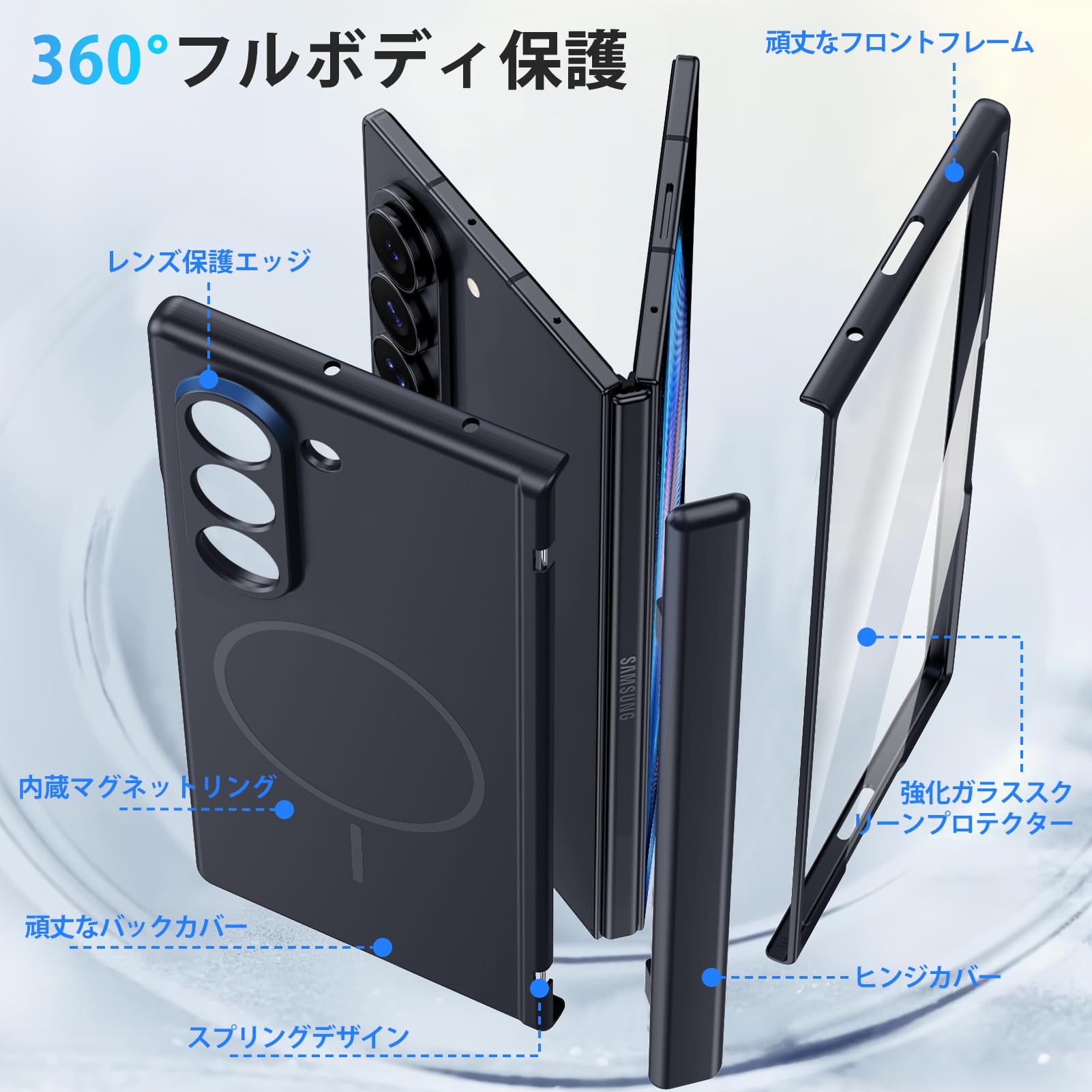 Galaxy Z Fold6 用 ケース MagSafe対応 ヒンジ保護 ガラスフィルム付き 米軍MIL規格 耐衝撃 レンズ保護 指紋防止 滑り止め マグネット搭載 マグセーフワイヤレス充電対応 携帯カバー ギャラクシー Z Fold6 用 ケース おしゃれ 薄型 ストラップホール付き スマホケース (マットブラック)