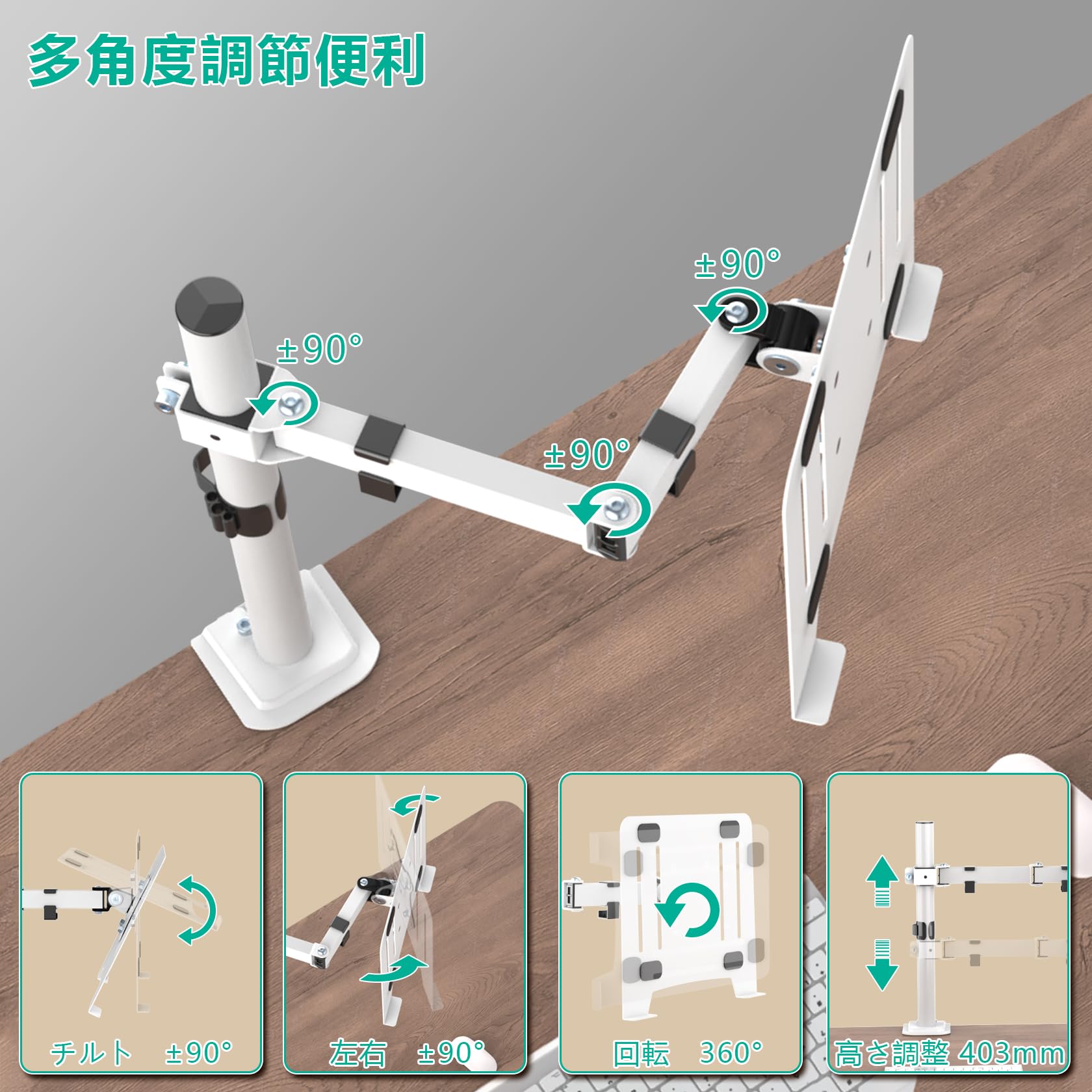 多角度調節:モニターは上向き90°、下向き90°、左右180°、回転360°に調節し、モニターアームは上下左右だけなく、前後にも動作し、画面との距離が調整可能です。モニターの縦横切り替えが簡単に行えます。