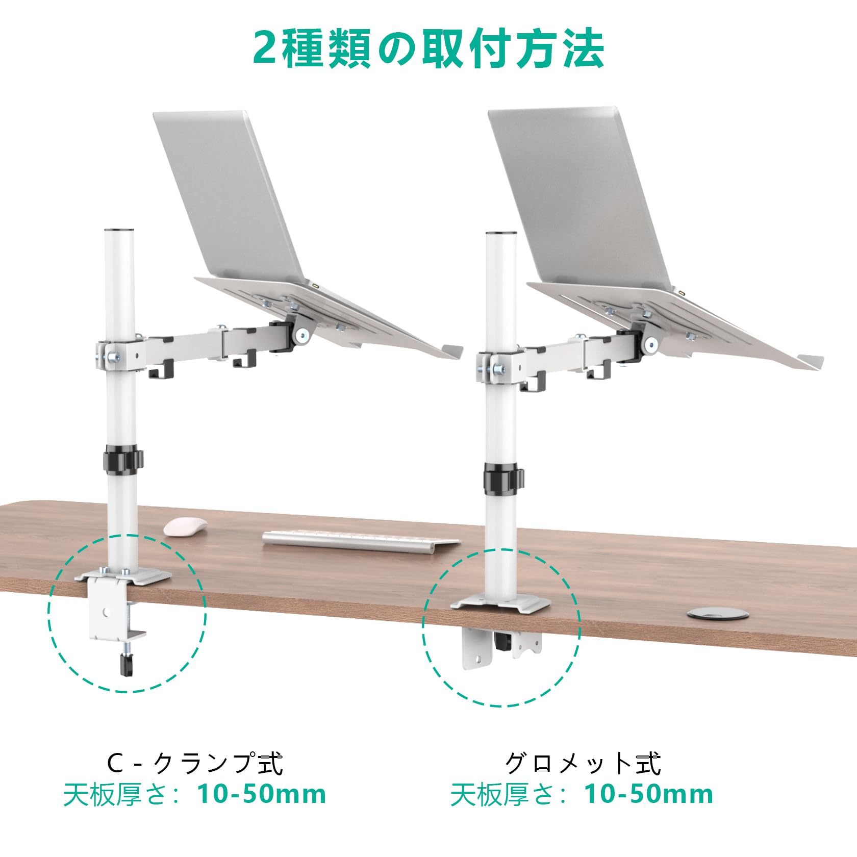 2種類取付方法:クランプ式とグロメット式でデスクにしっかり固定します。