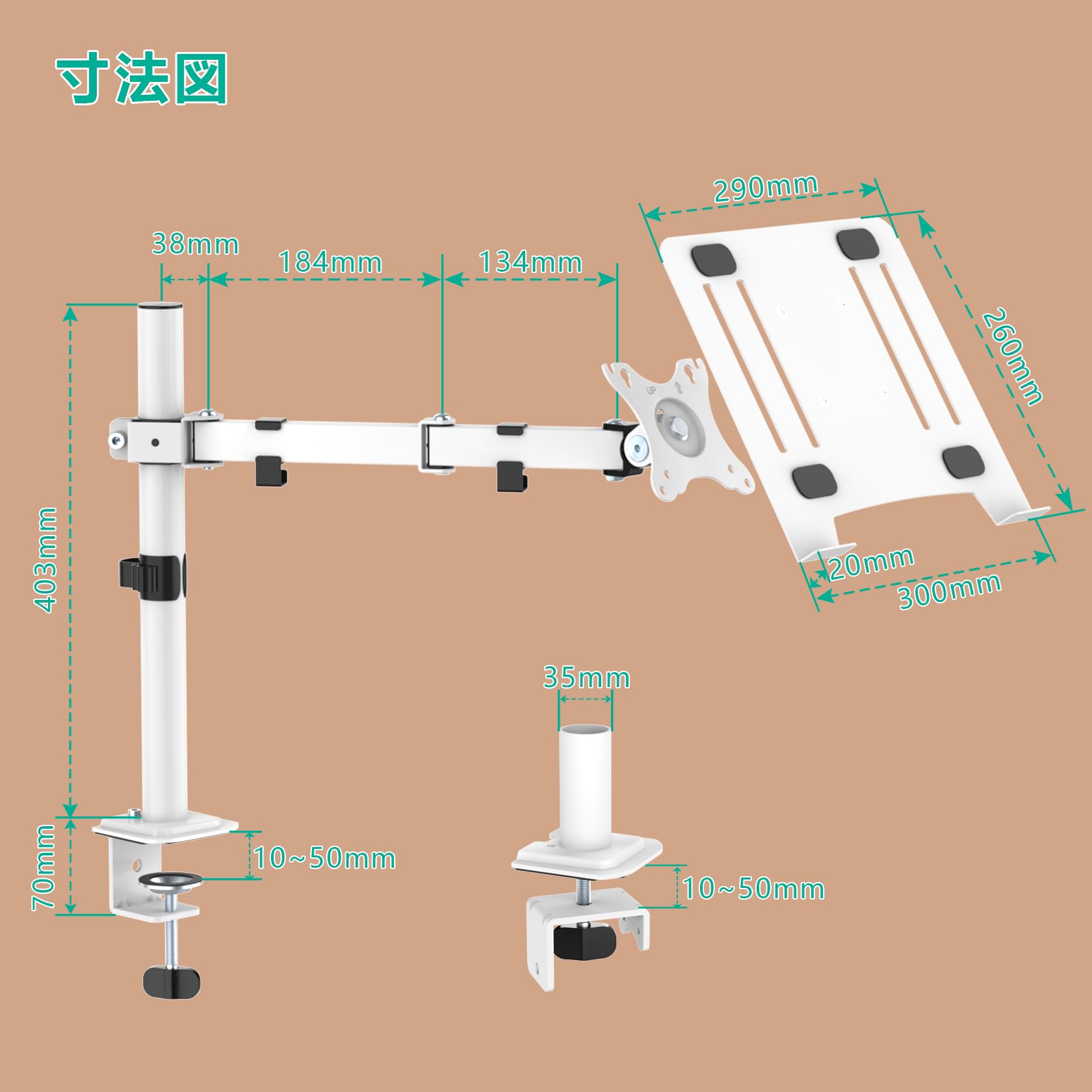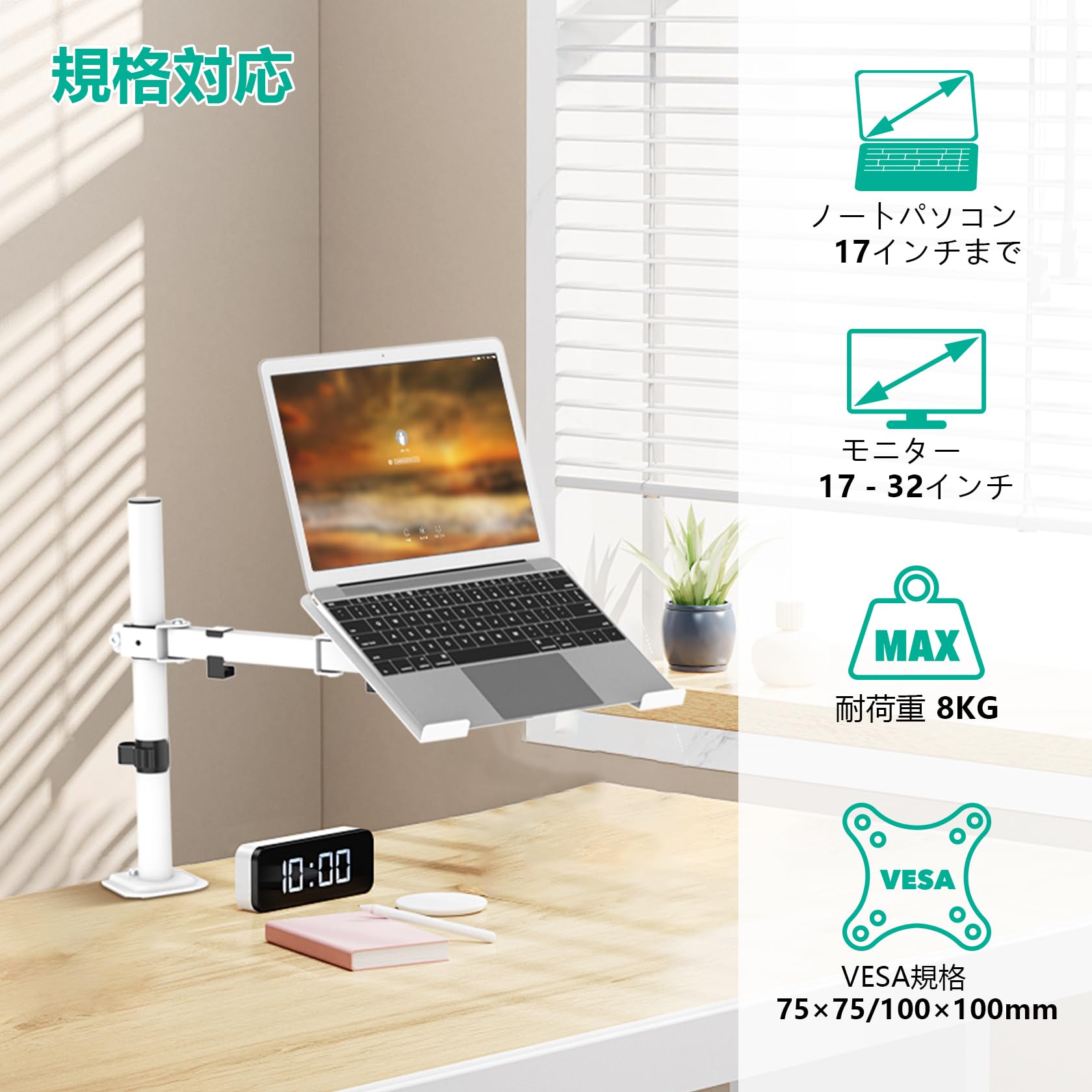 対応ノートパソコン:17インチまでのノートパソコンに対応できるモニターアームです。VESA規格:75mm x 75mm、100mm x 100mm、耐荷重は2-8kgです。