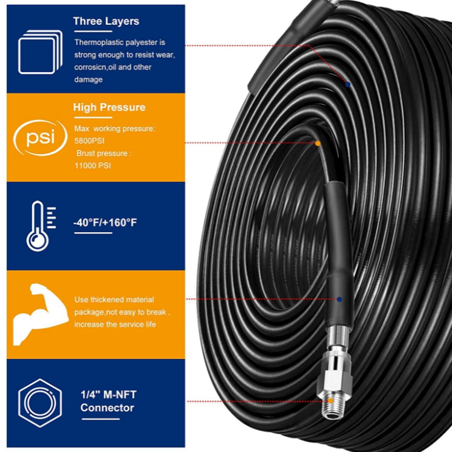 【製品仕様】:高圧洗浄ホース 全長10M,内径6mm,外径12mm。重量:1.2kg 最大圧力:40MPa(5800PSI) 耐熱 : 70℃。