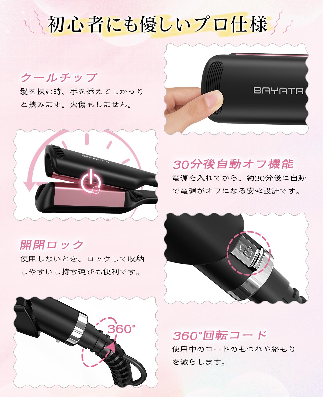 【初心者でも簡単にウェーブ巻きが作れる】?挟むだけで綺麗なウェーブカールができます。?手を添えても安心するクールチップで挟んで火傷防止します。 ?温度調節ボタンがハンドルの間に配置して、使用中温度を誤調節恐れがありません。?使用中もつれや絡まりにくい360度回転コード、長さは約2メートルで、自由にヘアスタイリングできます。?30分後が自動オフになります。 ?海外対応:100V-240Vの電圧対応 ※変圧器が不要ですが、変換プラグを用意してください。