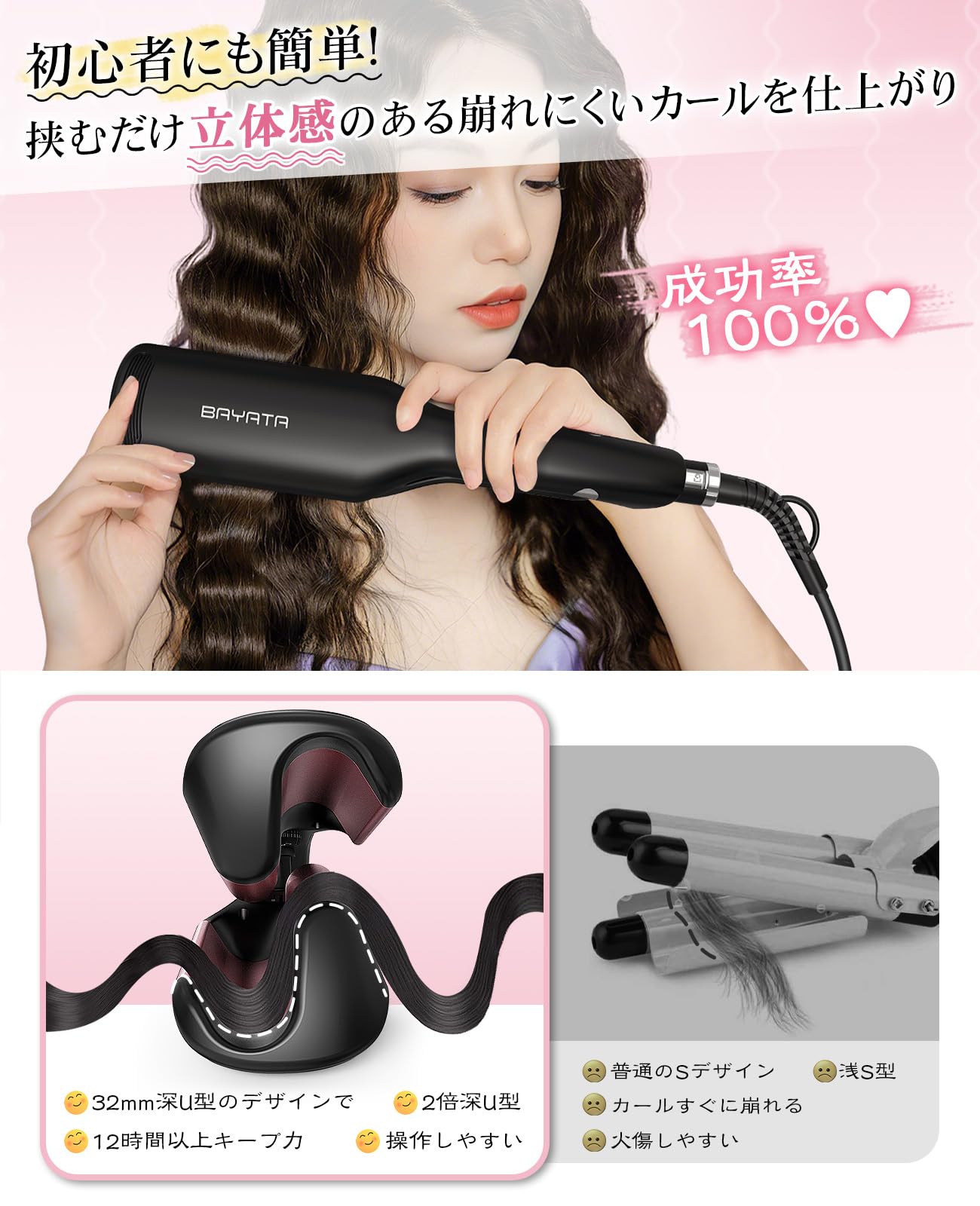 【人気】BAYATA コテ 32mm ヘアアイロン ウェーブアイロン ワッフルアイロン【初心者向け・挟むだけで巻き髪作る・千万級マイナスイオン吹出】カールアイロン ウェーブ巻き 100℃〜210℃温度調節 全髪質対応 韓国風ヘアスタイル やけど防止 海外対応 PSE認証済 日本語取扱説明書付き