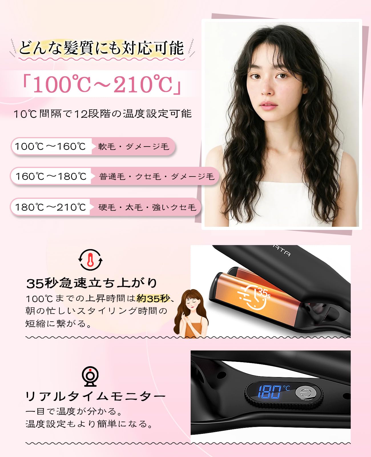 【急速な立ち上がり時間】ダブルPTCヒーターが搭載されるので、バレルの加熱が均一になり、立ち上がり時間も他の同類品より早いです。このウェーブアイロンは電源を入れてから約35秒で使用可能な温度(100℃)に達します。全部髪質に対応する160℃まで60秒くらいがかかります。抜群な立ち上がり時間のかけで、忙しい朝も、キレイなカールを作られます。