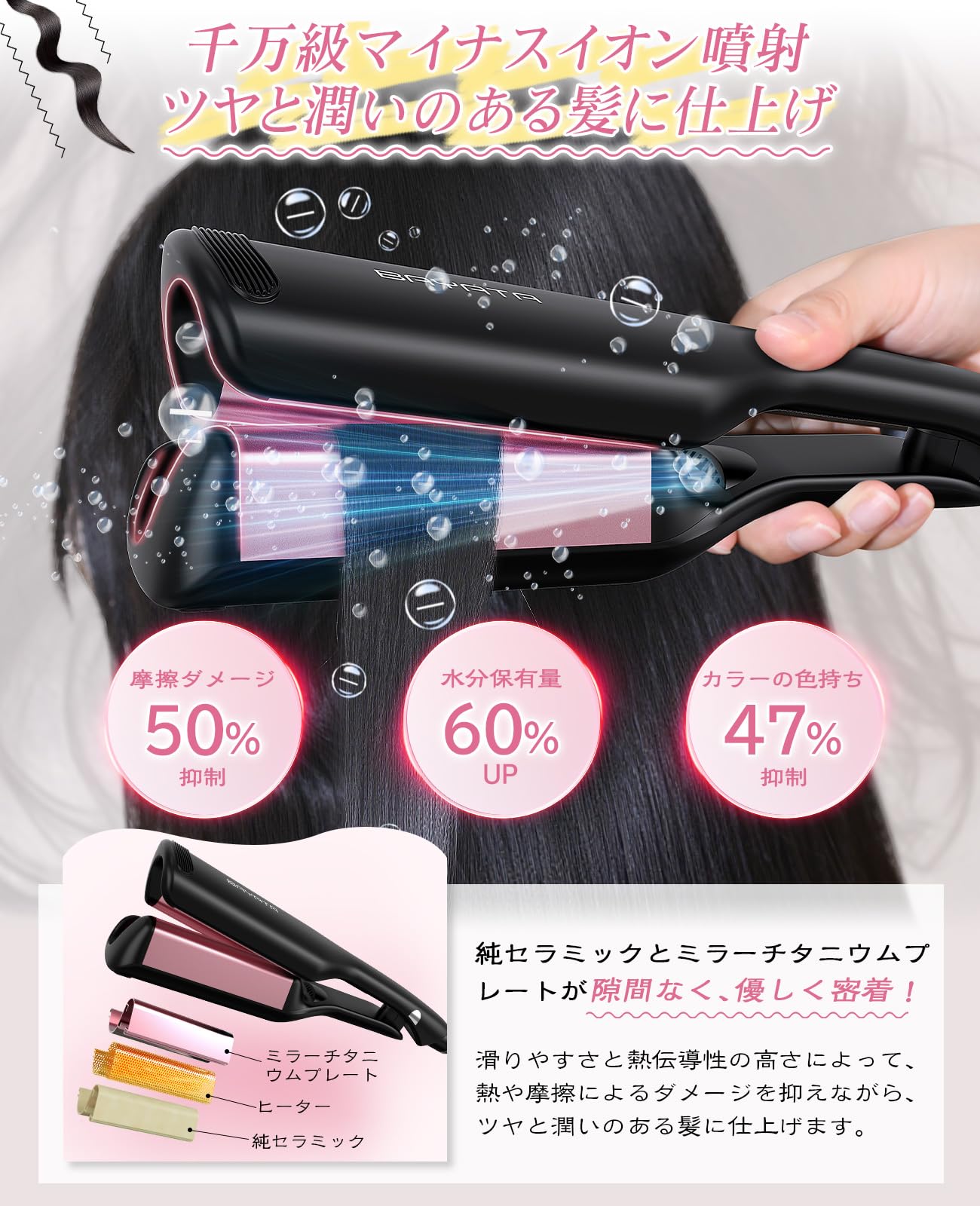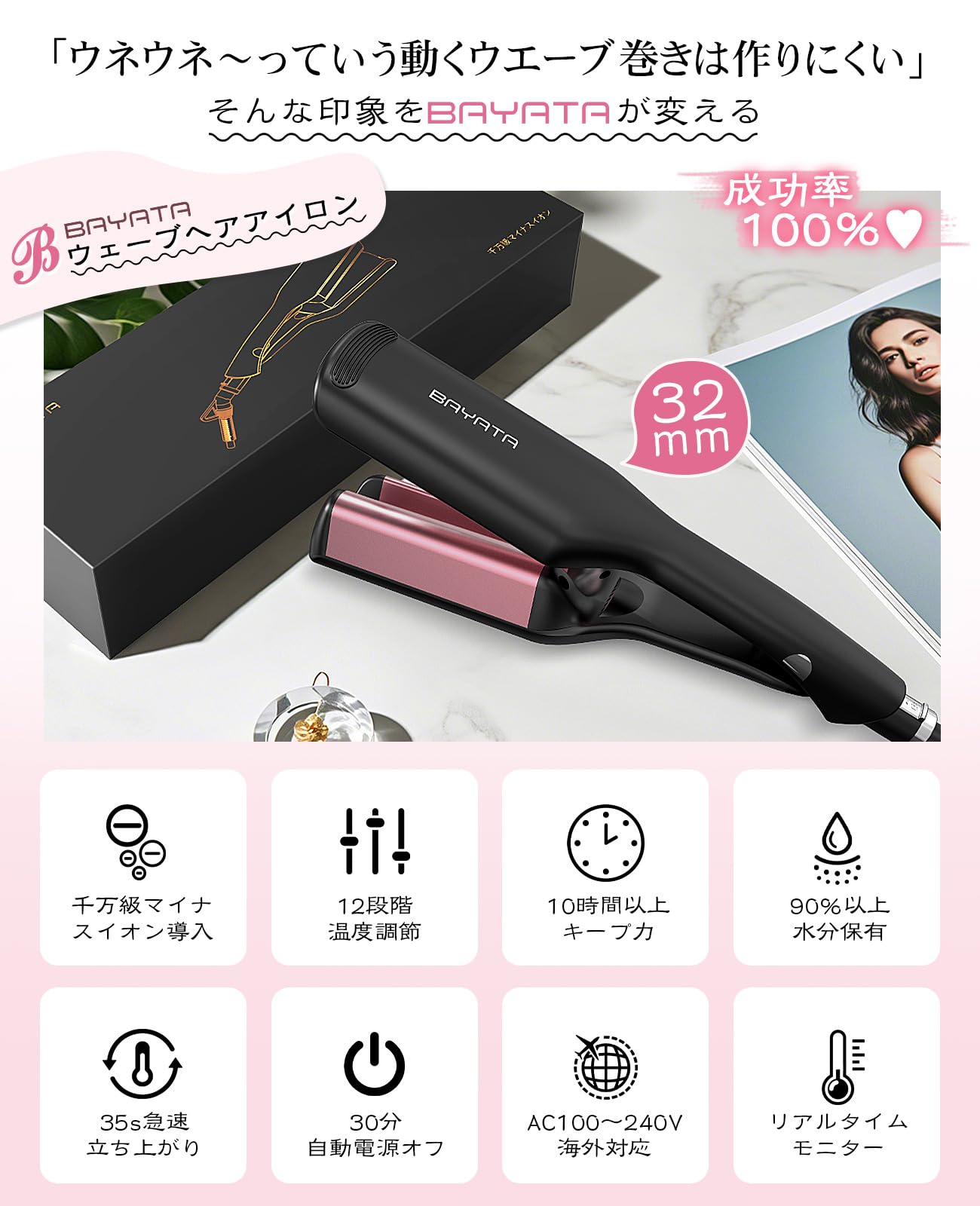 BAYATA コテ 32mm ヘアアイロン ウェーブアイロン ワッフルアイロン【初心者向け・挟むだけで巻き髪作る・千万級マイナスイオン吹出】カールアイロン ウェーブ巻き 100℃〜210℃温度調節 全髪質対応 韓国風ヘアスタイル やけど防止 海外対応 PSE認証済 日本語取扱説明書付き