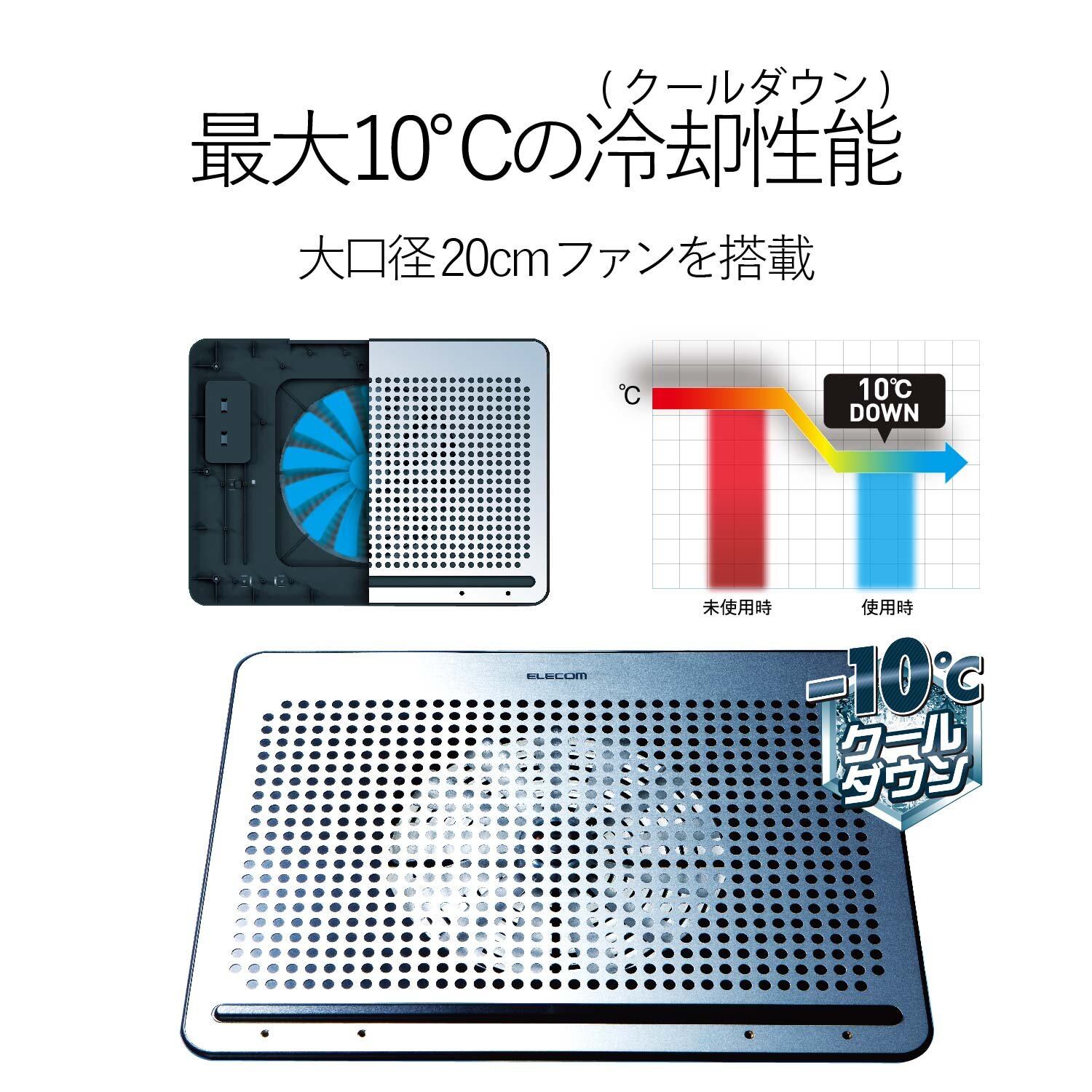 ■大口径20cmファンを搭載し、本製品未使用時との比較では最大約10℃の冷却効果を発揮します。