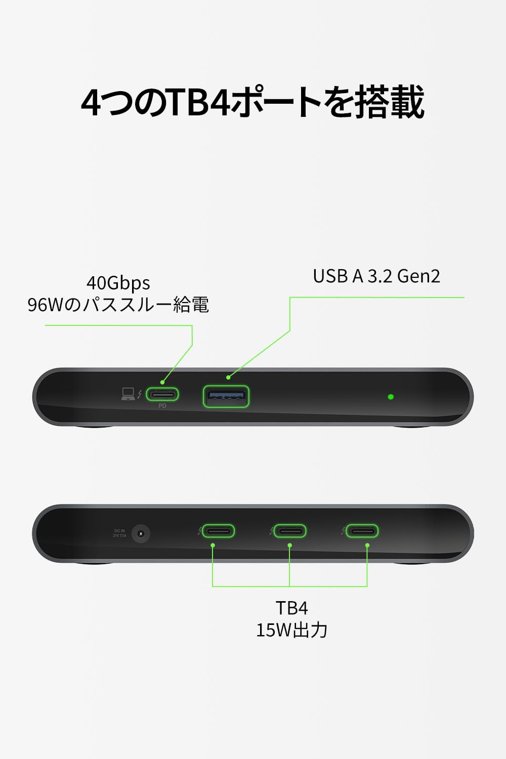 Belkinの5-in-1、ノートパソコン用ドッキングステーションINC013qcSGY。Thunderbolt 4対応。40Gbpsデータ転送。96W PD対応 デュアル4K/60Hz シングル8K/30Hz 150W電源ユニット&TB4ケーブル(0.8m)付属。
