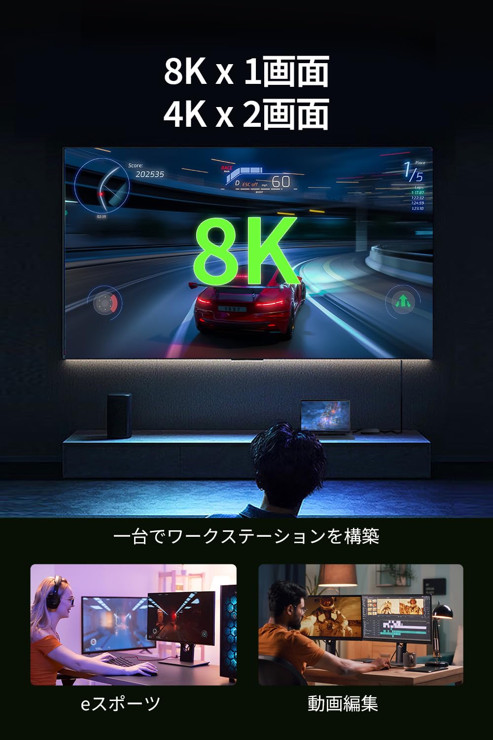 【デュアル4Kモニター対応】 ケーブル一本で、2台の4Kモニターに60Hzで出力可能。また8K・30Hzシングルモニターの出力にも対応しています。