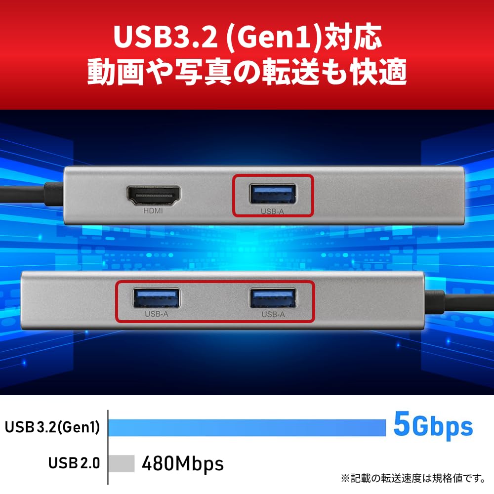 ■Type-AポートはUSB3.2(Gen1)対応のため最大5Gbpsの高速データ転送が可能。