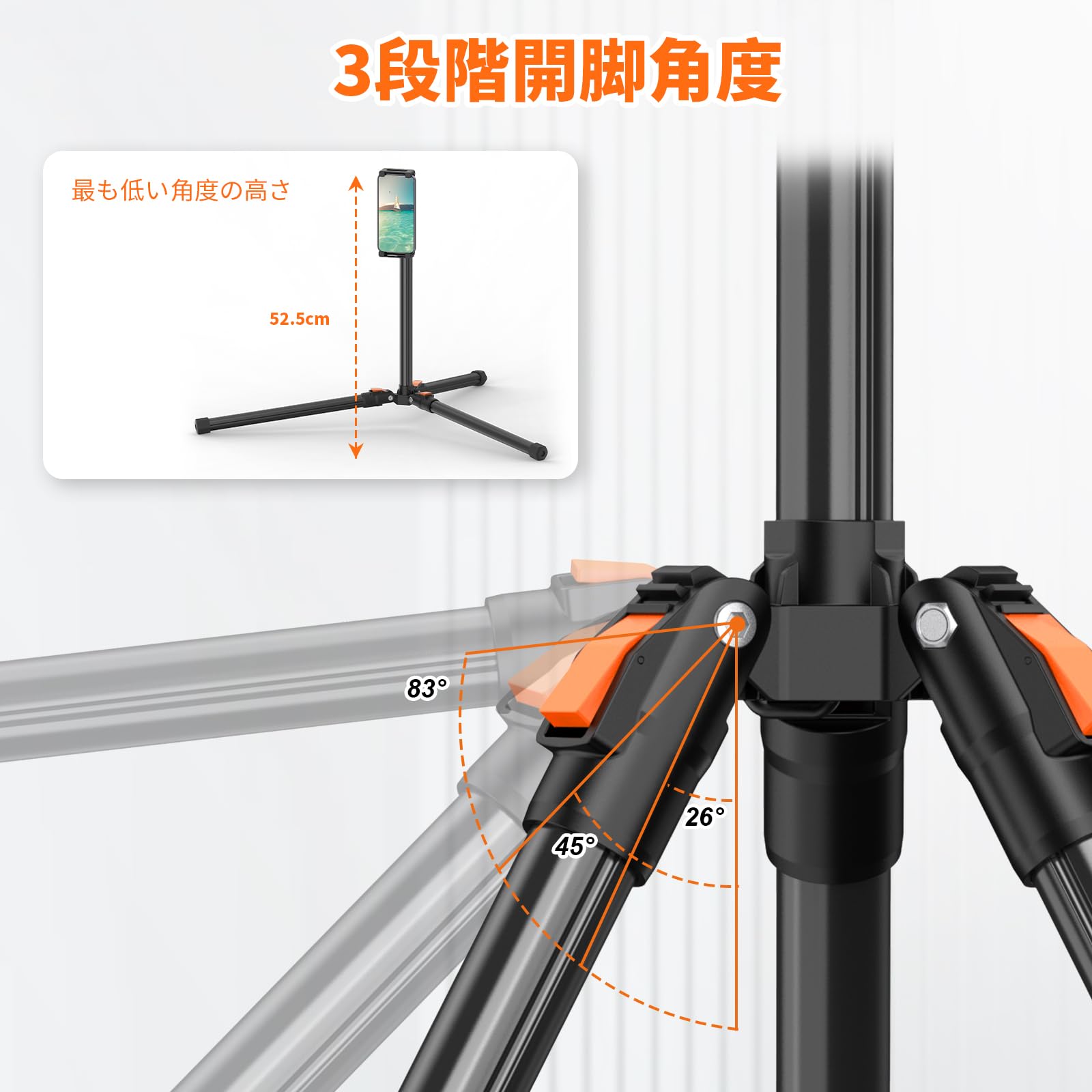3段階開脚角度調整&高い安定性: 特殊な開脚角度調整ロックにより、様々なニーズに合わせて 3 段階の角度を調整できます。83°に調整すると、タブレット三脚スタンドは最小の高さになり、ローアングル撮影を可能にします。各脚の角度を個別に調整できるため、階段や凹凸のある地面にも設置でき、非常に幅広で安定したベースを実現します。