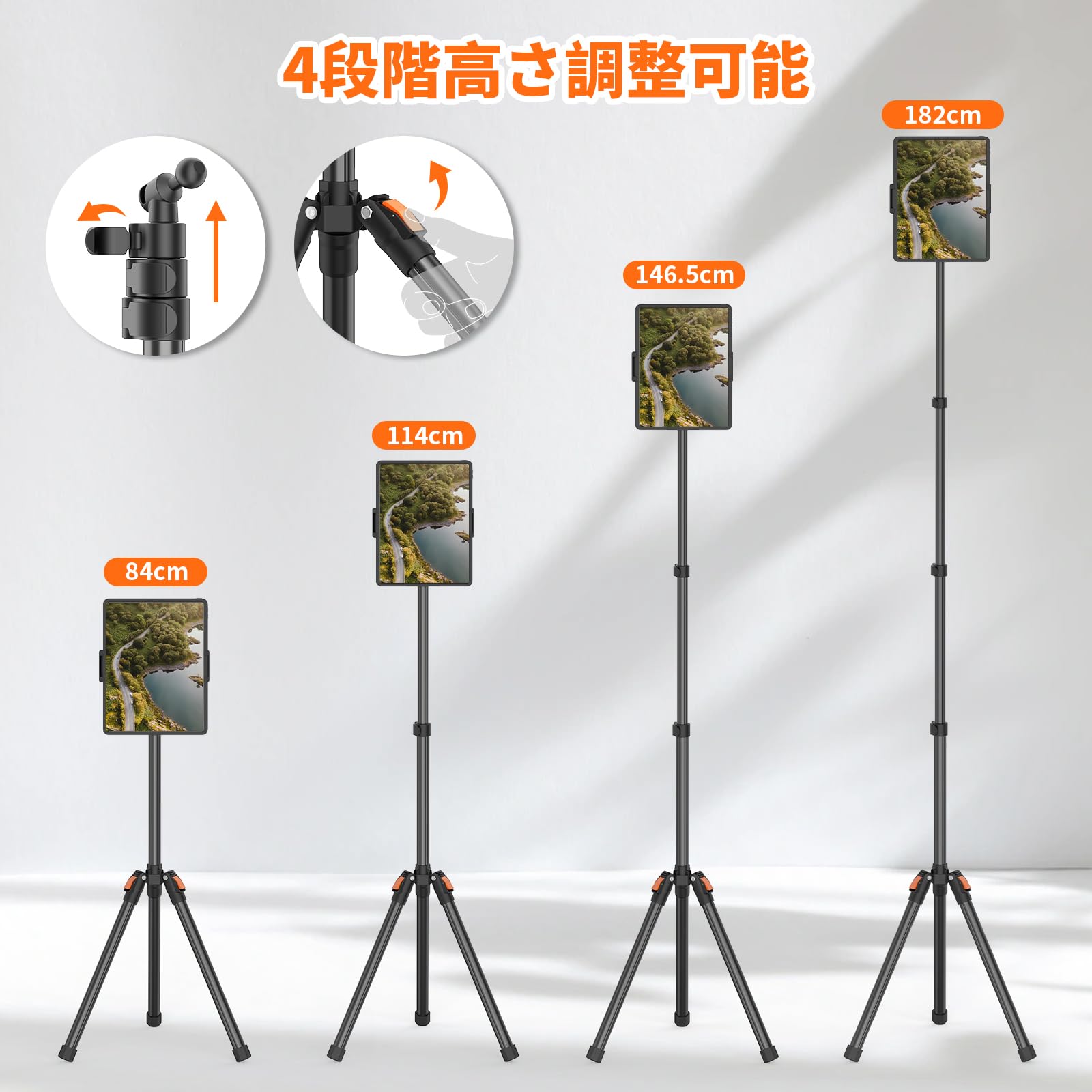182cm タブレット 三脚&4段階伸縮:XXZU iPad三脚は84cmから182cmまで伸びるため、立って使用したい時や座って使いたい時にも最適な視角を確保できます。4段階の伸縮機能で、自分の使いやすい高さに簡単に調整でき、長時間の使用でも疲れにくく快適です。異なる身長にも対応しており、家族全員で共有できる点も大きな魅力です。