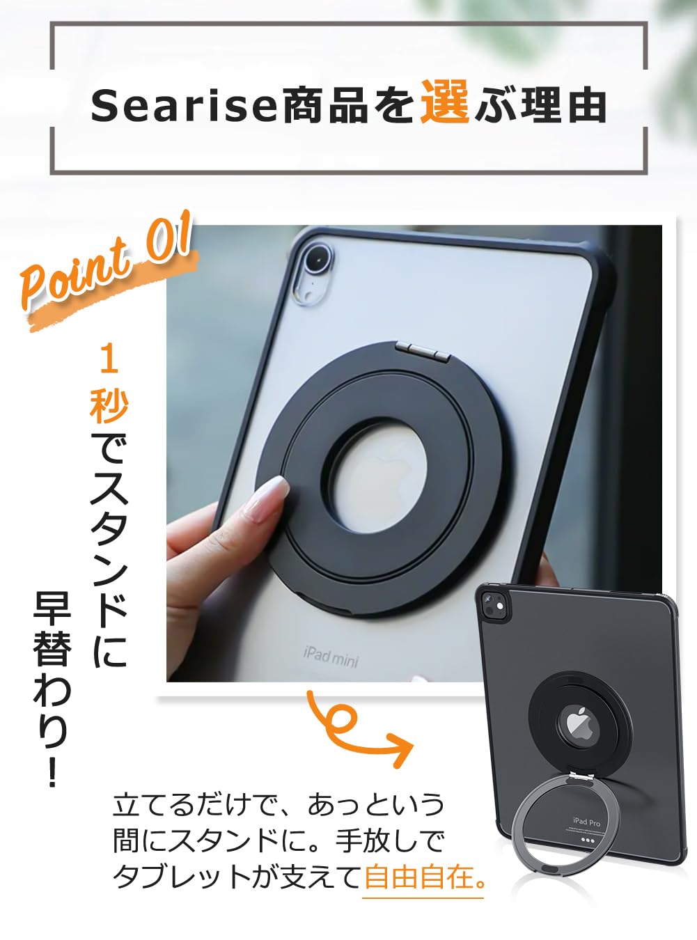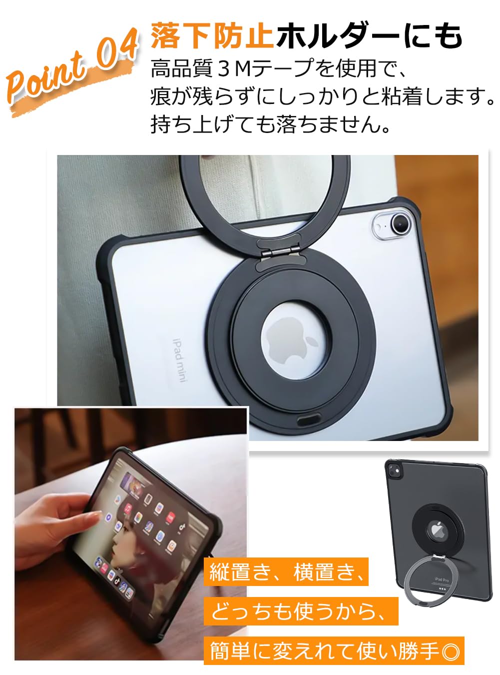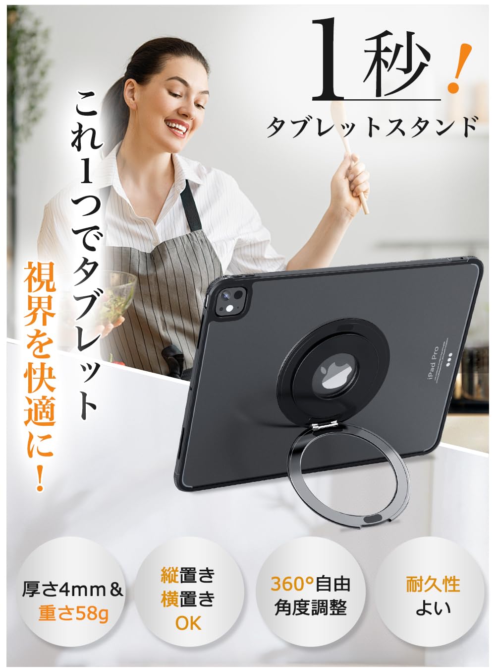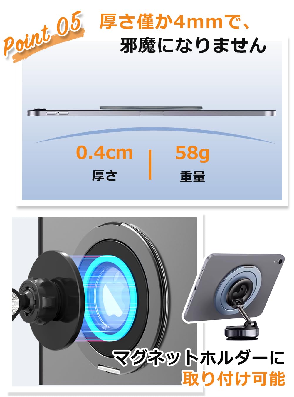 ?【持ち運びに便利な薄型】タブレットスタンドは厚さが4mm、重さがわずか58gです。携帯するときにはほとんど感じられず、使用時には見えないほどコンパクトです。軽量設計により持ち運びがしやすく、カフェ、オフィス、出張先など、どこでも快適に使用できます。