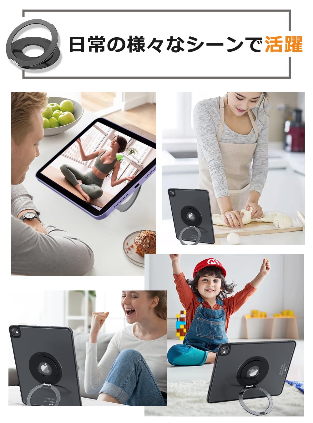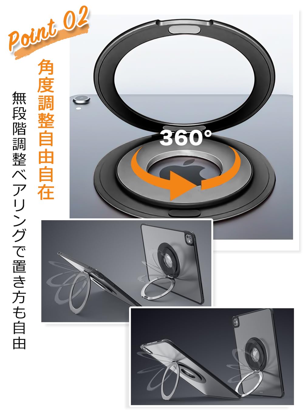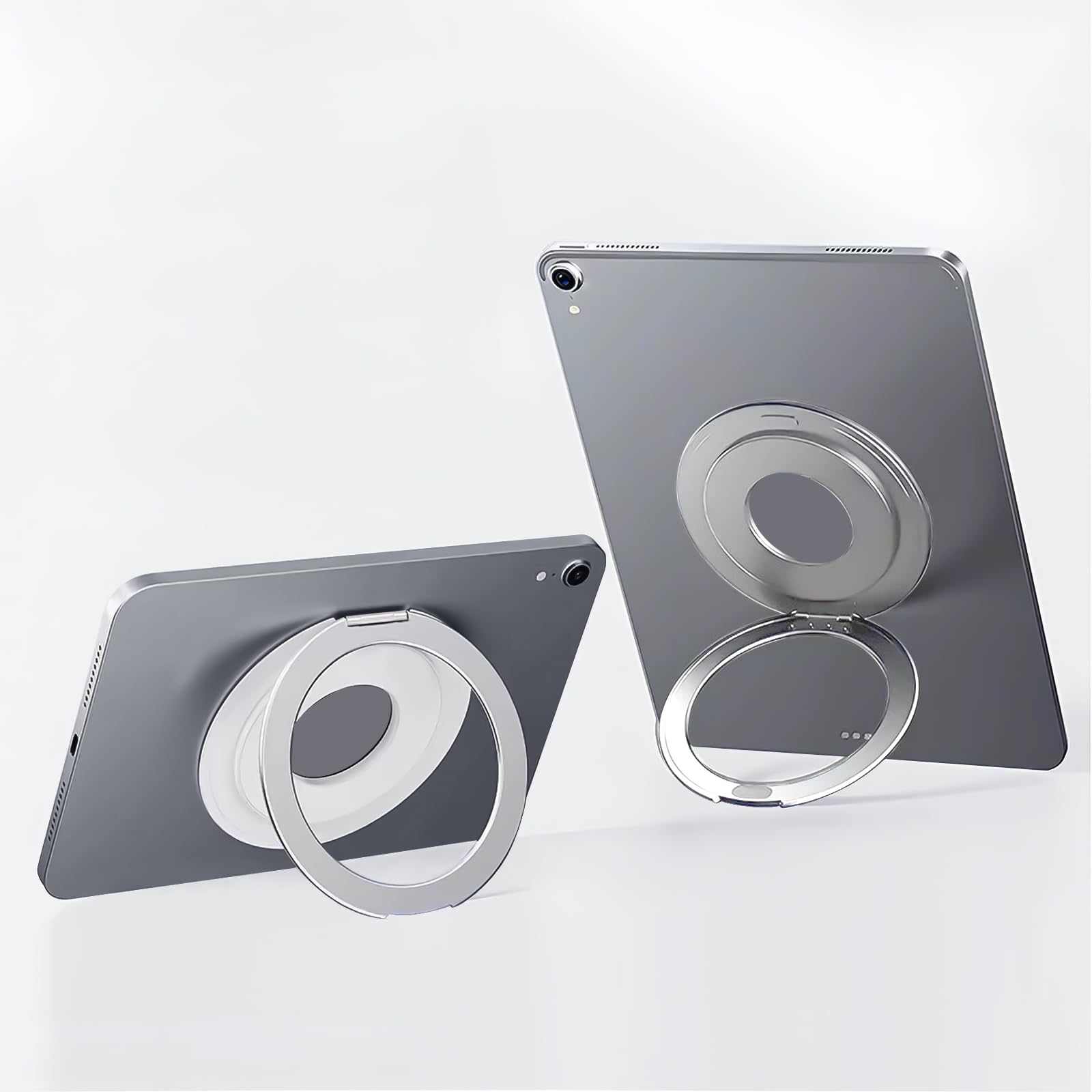 タブレットホルダー タブレットスタンド iPadスタンド【軽量&薄いリング型】卓上 横置き 縦置き 持ち運び便利 360度調整可能 マグネット設置可能 折りたたみ式 iPad Pro/Air/mini/Kindle 多機種対応 貼り付け パッド 落下防止 (シルバー)