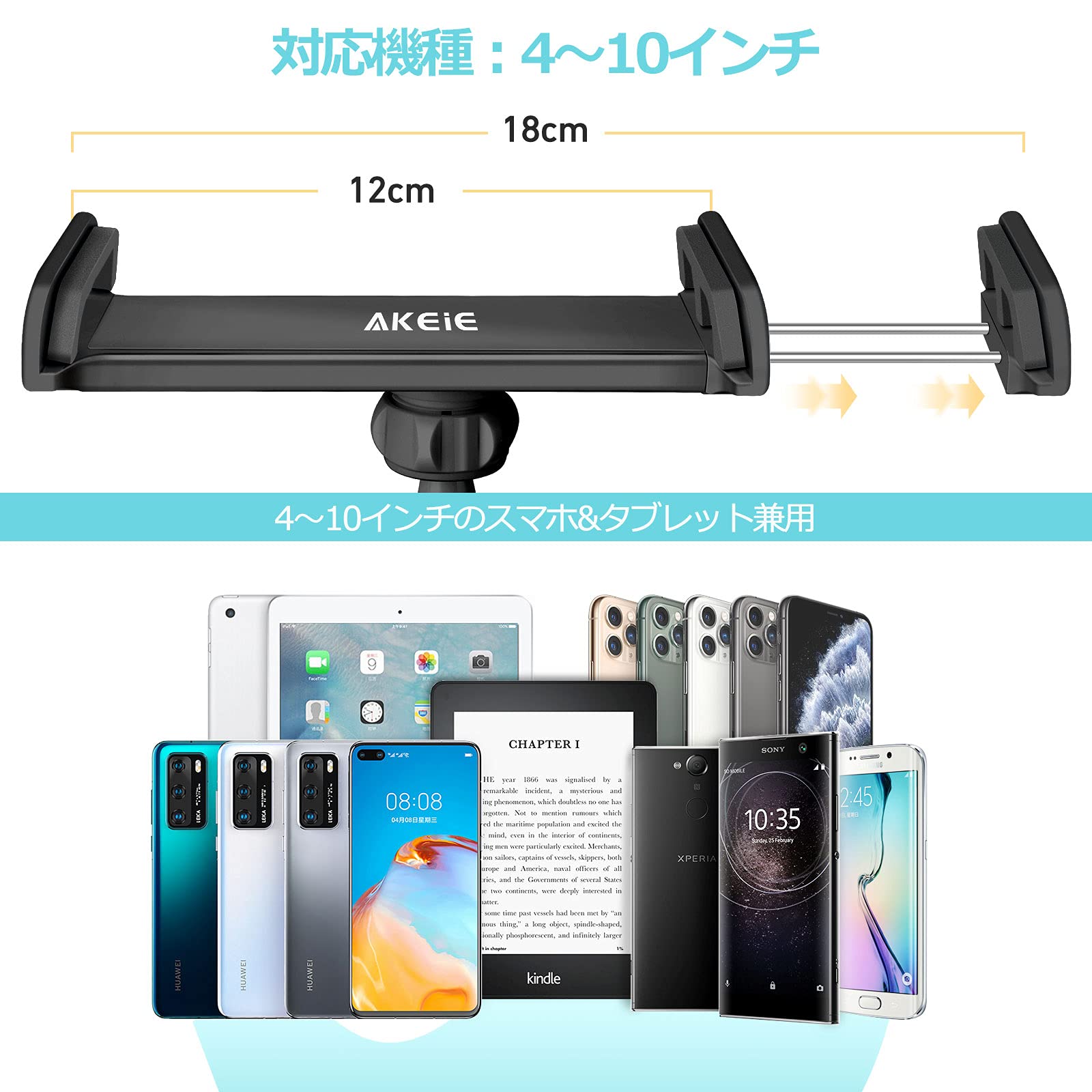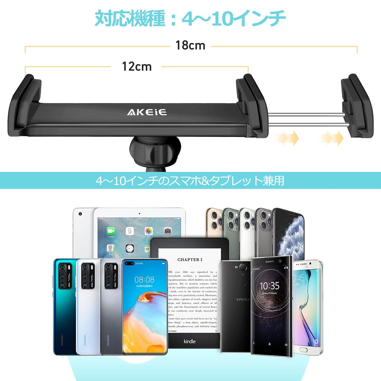 【多機種対応】本製品は幅12-18cm「4-10インチ」のスマホ、タブレット、Switchなどに適応。充電ケーブルとイヤホンを通せる優しいデザインで、動画見ながら充電と音楽たのしむのがすごく便利です。対応機種の例:Ipad, Ipad mini,Iphone 5/6/7, ipad air, ipad air2, REGZA Xperia Galaxy ARROWS tab, SONY ELUGA Live Kindle