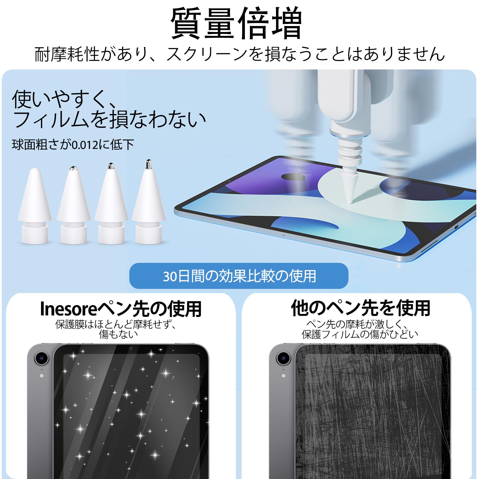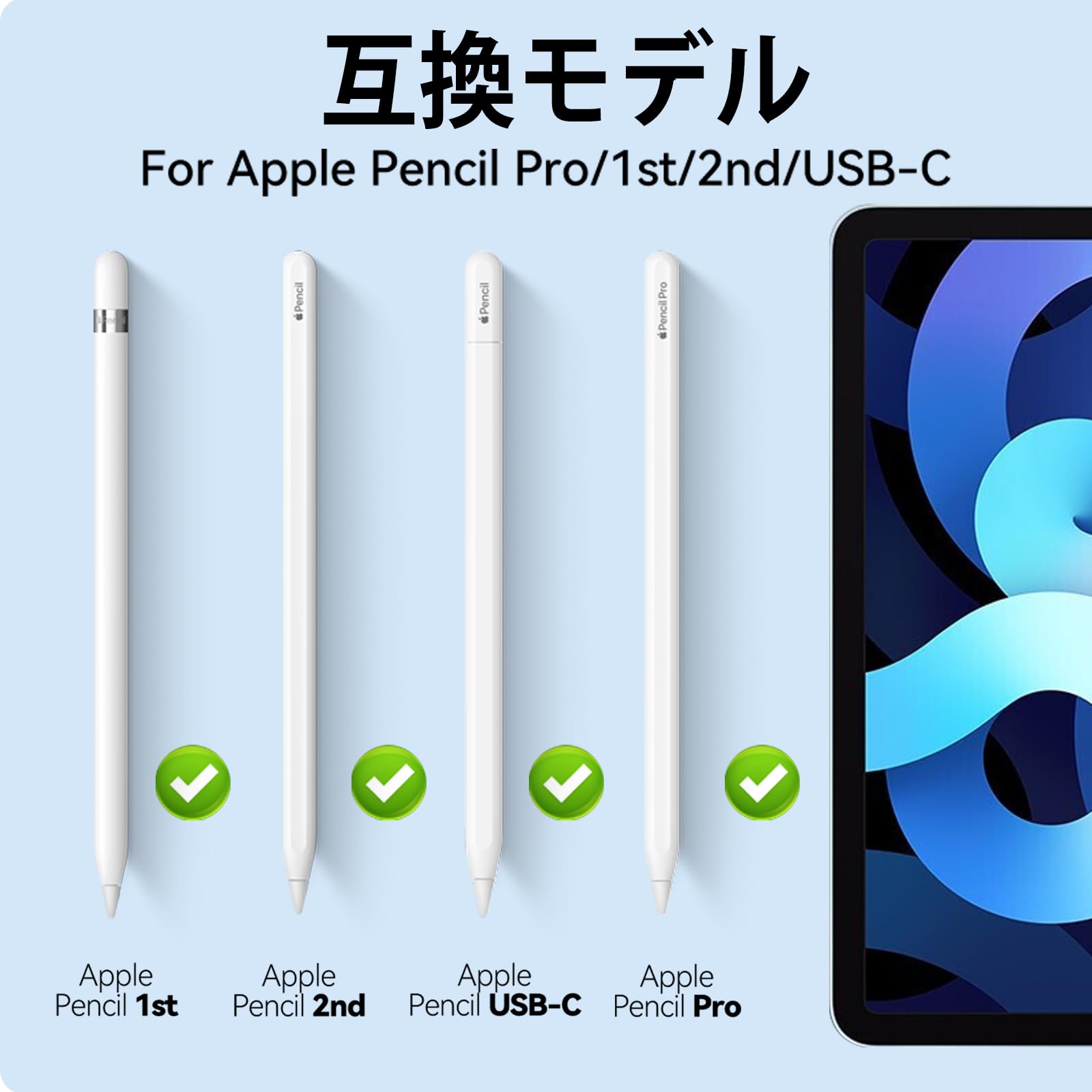 【互換性】アップグレード版 ipad ペンシル ペン先、Apple Pencil Pro / 第1世代/第2世代 / USB-C の互換性、4種類のサイズの Apple pencil ペン先 -11インチ、9.7インチ、10.5インチ、12.9インチ(各2本)、注意:ペン先を「純正Apple鉛筆」に取り付ける