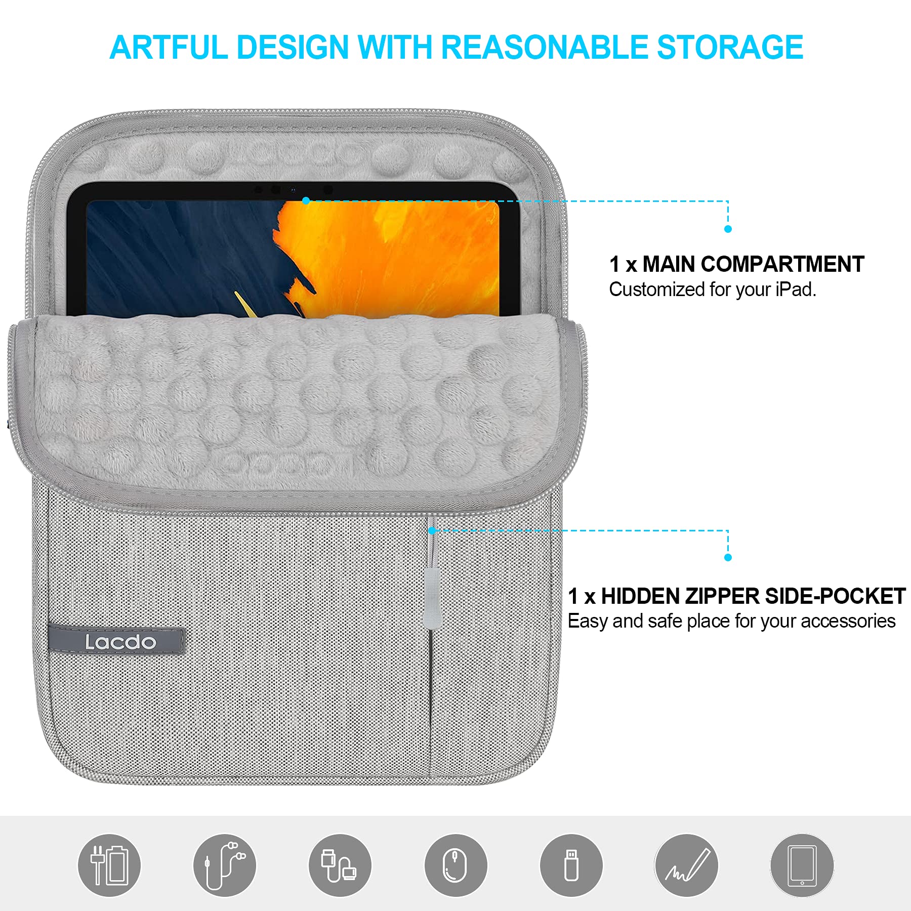 十分なスペースとスムーズなファスナー - フロントにもポケット付き。アクセサリーの保管に十分なスペース。スリーブのトップローディングのファスナーはスムーズに開閉でき、タブレットの出し入れに便利です。