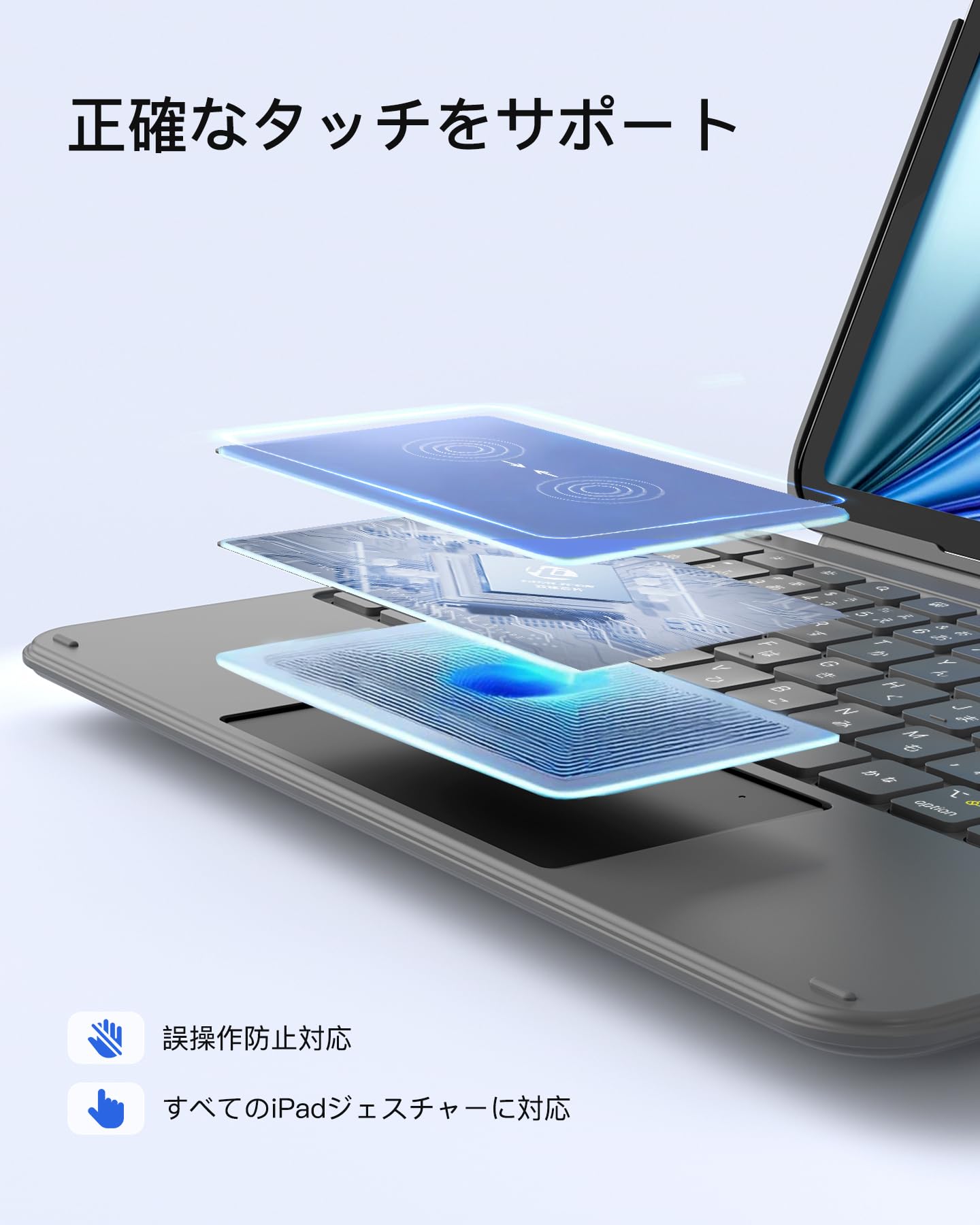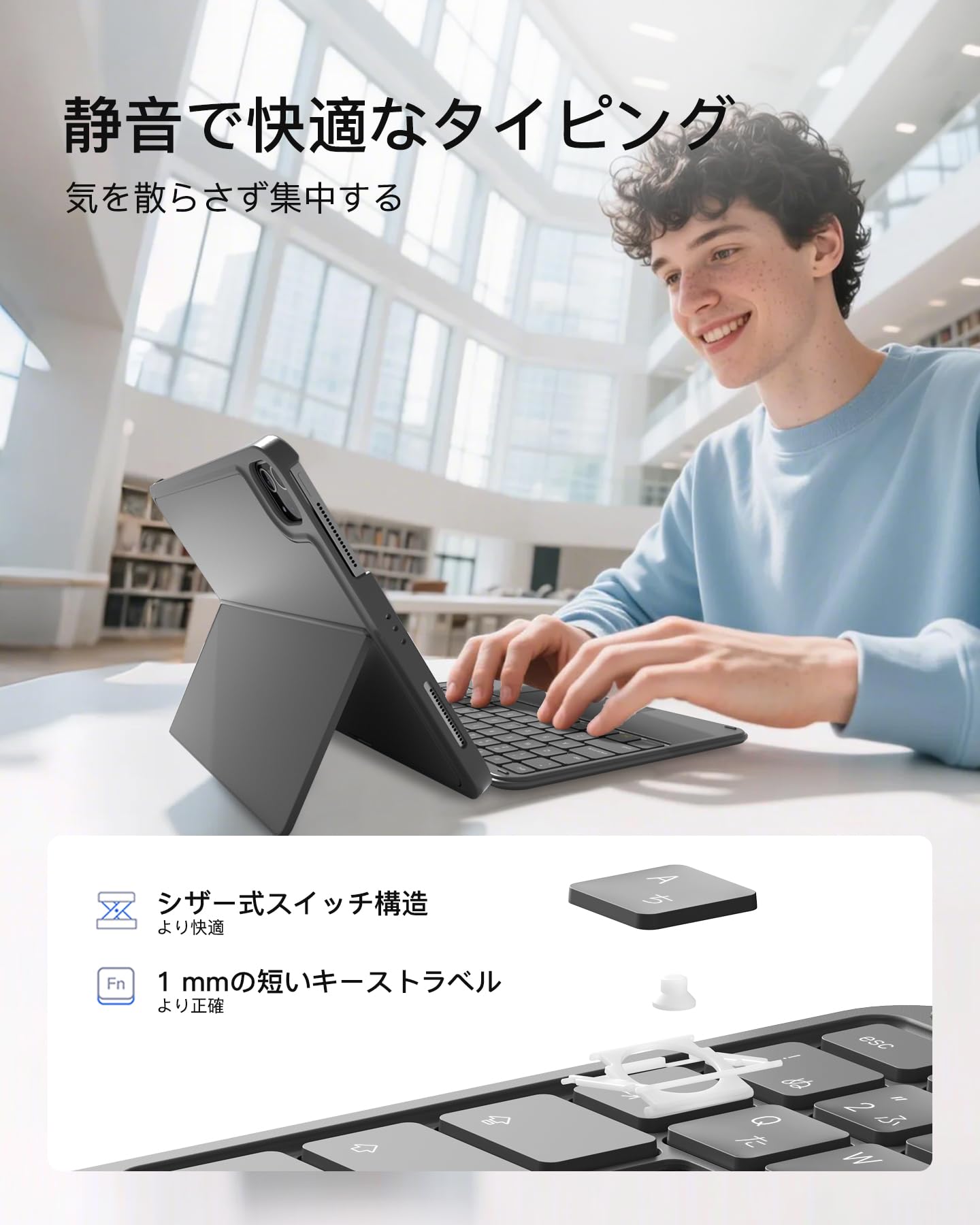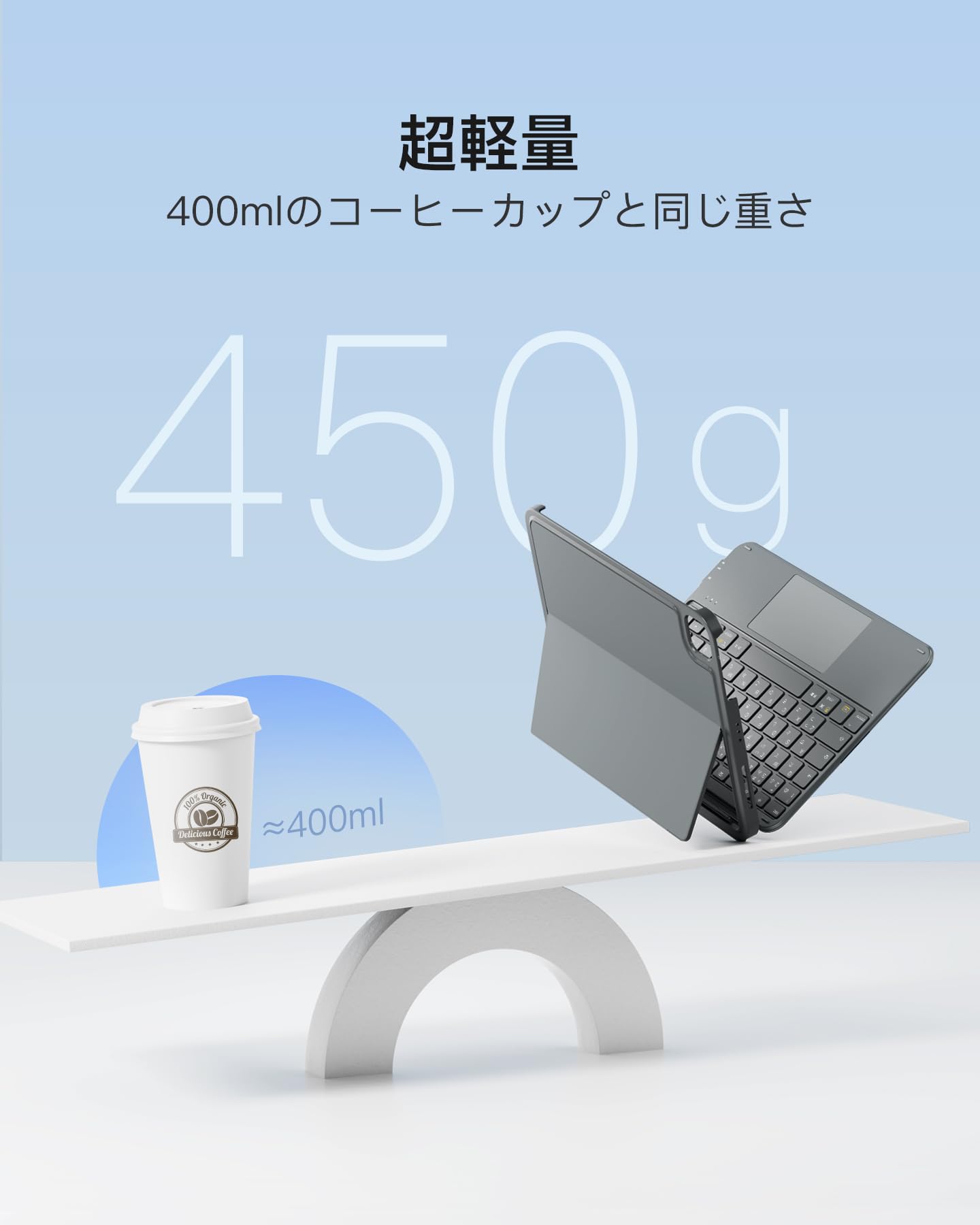 超薄軽量:ipad a16 キーボードの厚さはわずか7.6mm(コイン3枚重ねた厚さ)、重量はたった450g。他社フル機能キーボードより200g軽量です。通勤時はビジネスバッグに詰め込み、出張時はリュックに入れてもスペースを取らず、片手で簡単に持ち運べます。地下鉄で急な文書修正やカフェでの待ち時間にメール返信、モバイルワークがこれまで以上に楽に