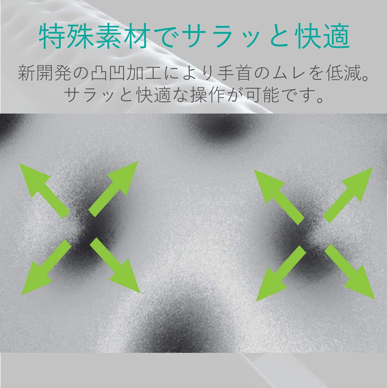 手首にやさしくフィットして左右の動きにも柔軟に対応します。手首の負荷を吸収分散する低反発ポリウレタン採用。デスクにぴったりと吸着してズレや移動を防ぎます