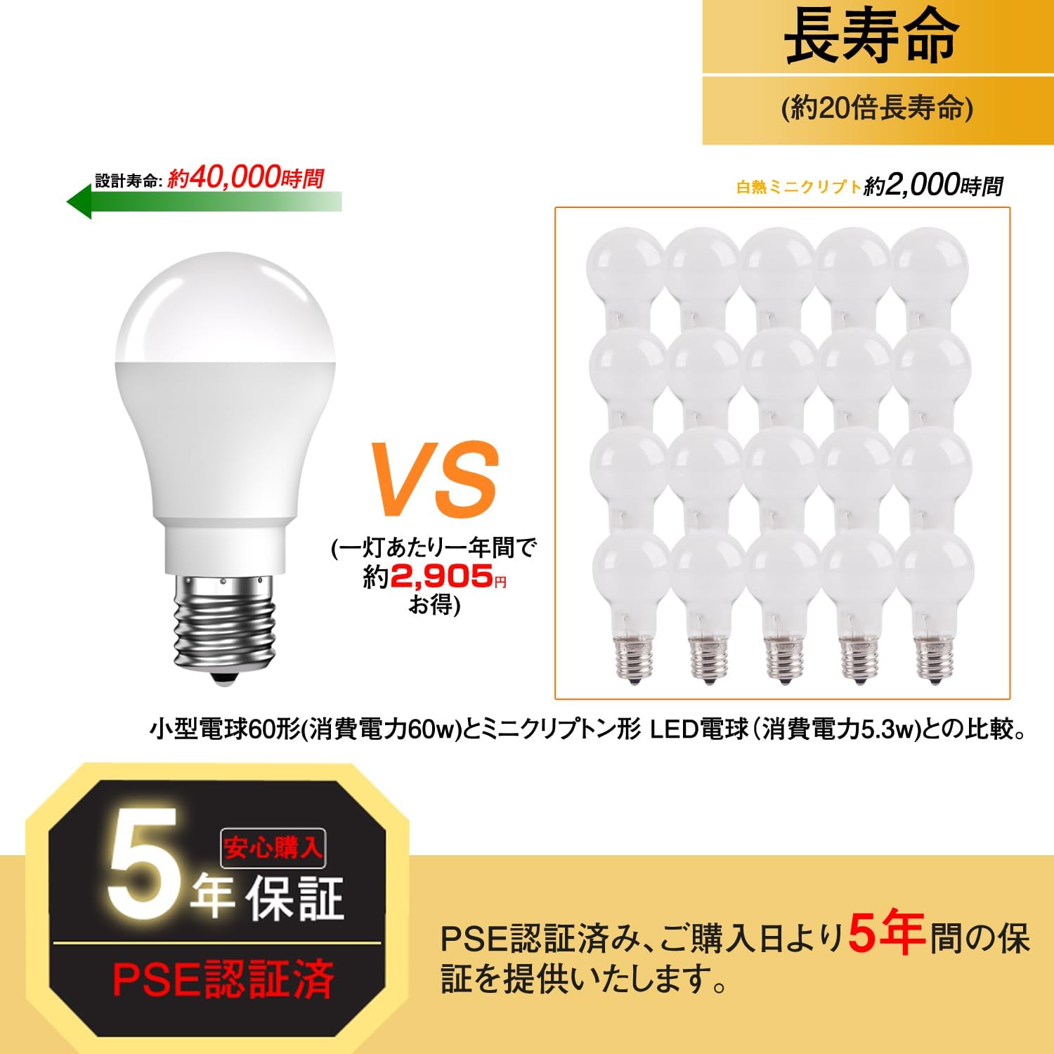 PSE認証済み,5年間の。断熱材施工器具対応、 屋外用器具への取り付け対応、 調光器対応:X