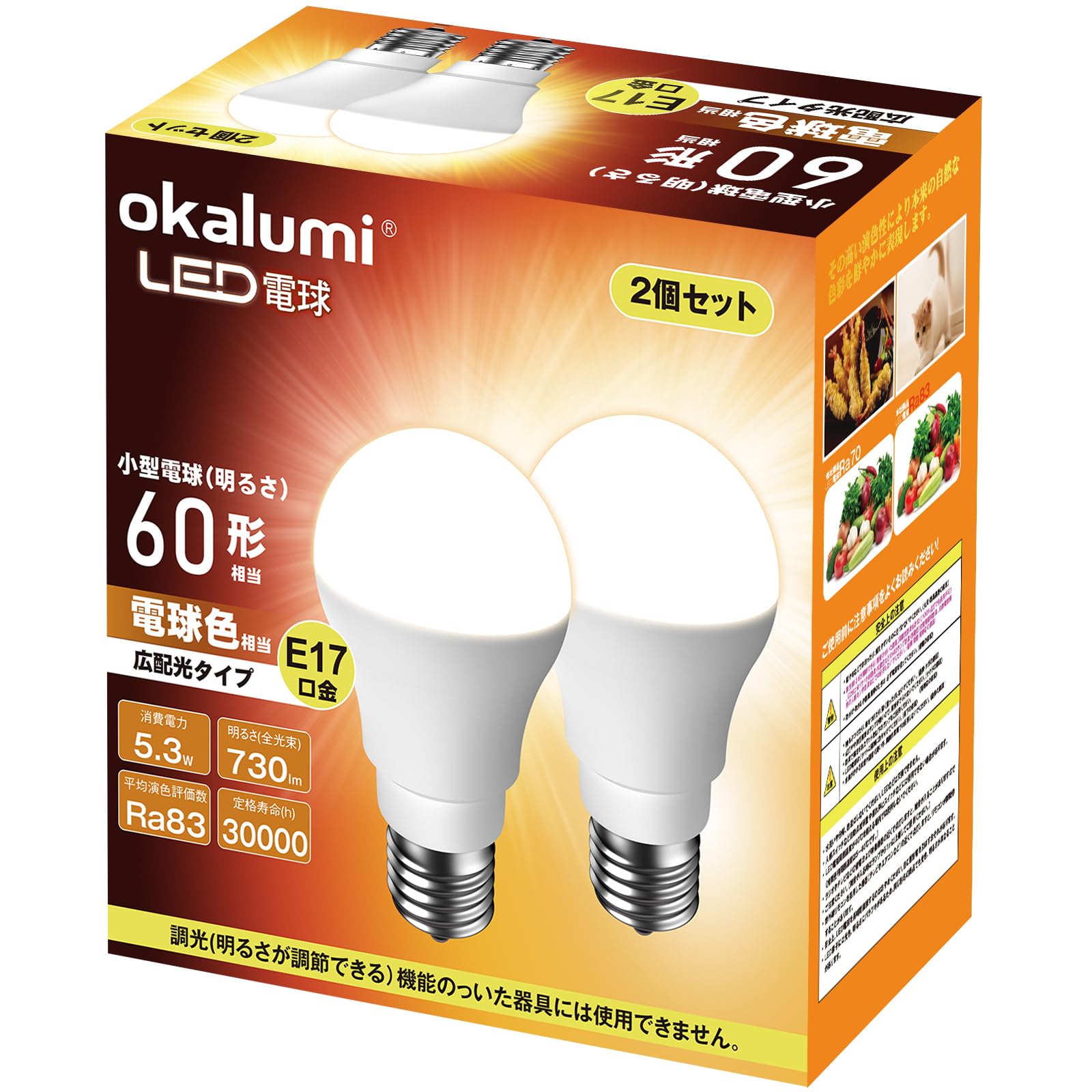 ミニクリプトン電球 LED電球 口金直径17mm 電球色 60W形相当 広配光 2個セット 730lm 断熱材器具対応