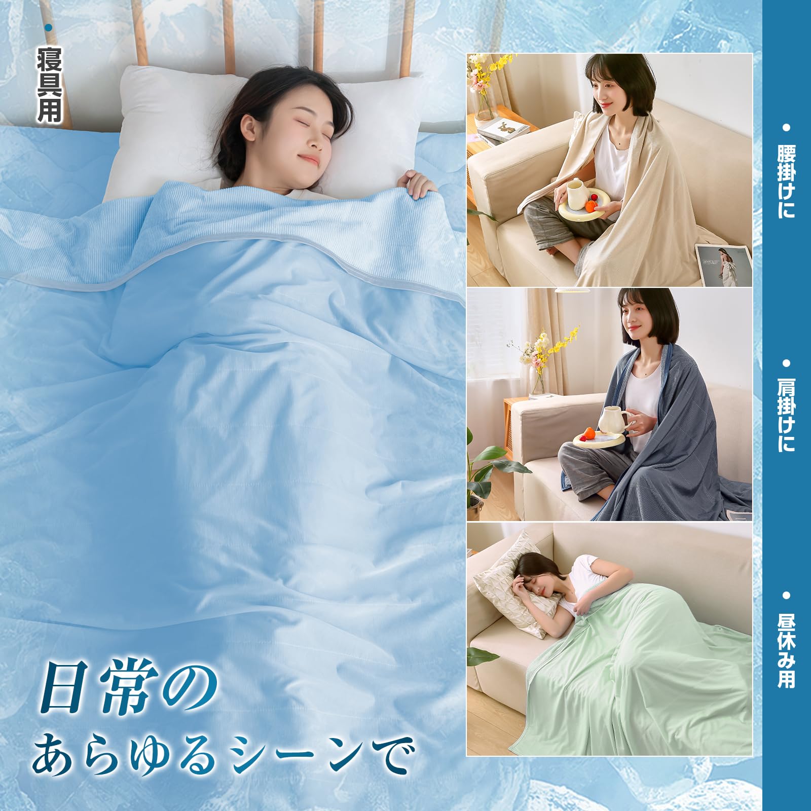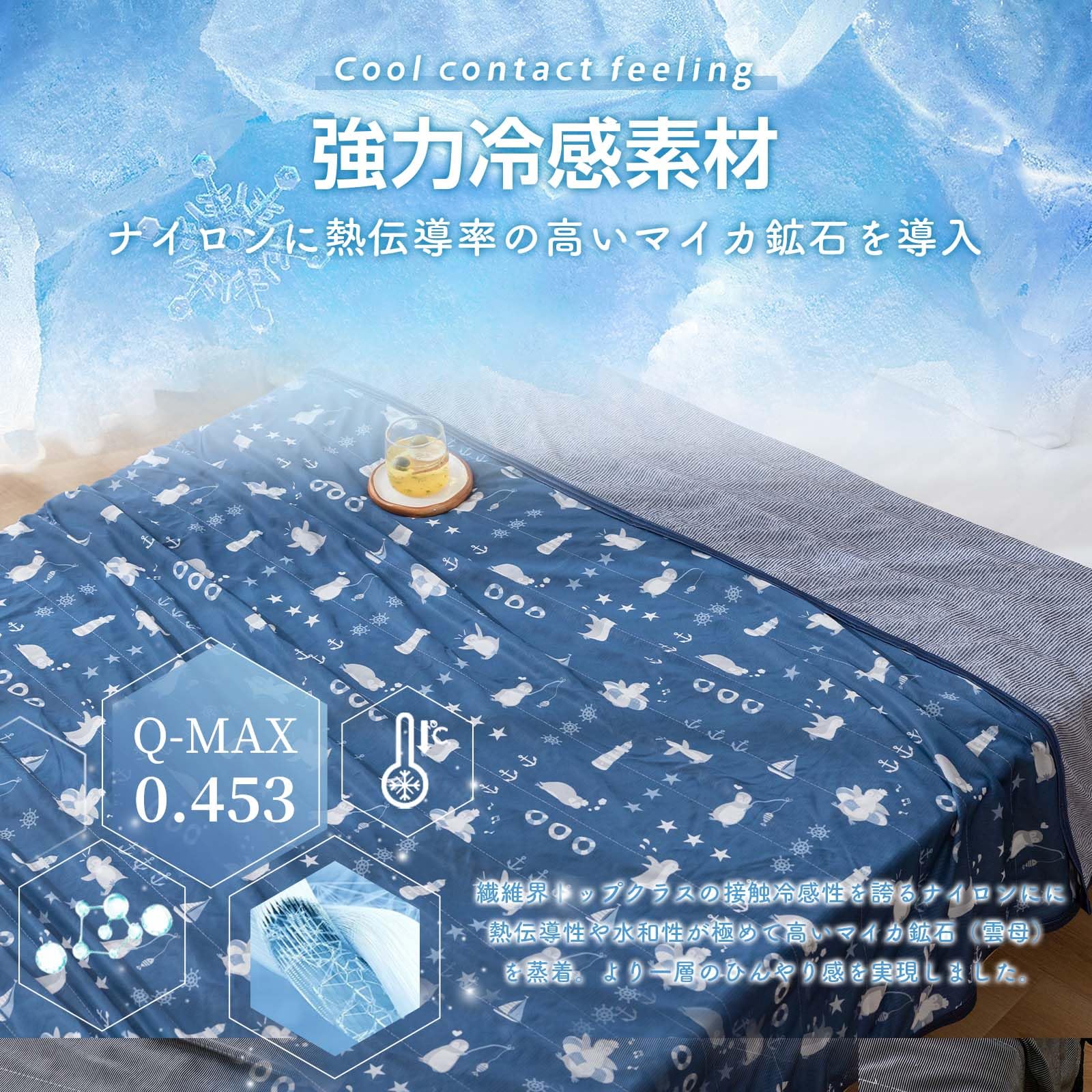 【接触冷感:Q-MAX値は0.453!】化学用品を添加しない接触式冷感素材を利用!寝返りのたびに心地良いひんやり感が伝わり、寝苦しい夜にもひんやりとした感触をお楽しみいただけます。冷房との併用でさらにひんやり!?やさしくお肌を守る−薄着で寝ることが多い夏に、エアコンの風や乾燥からお肌をまもります。肌あたりひんやり、寝苦しい夜も心地よく眠りにつけるクールケットです。