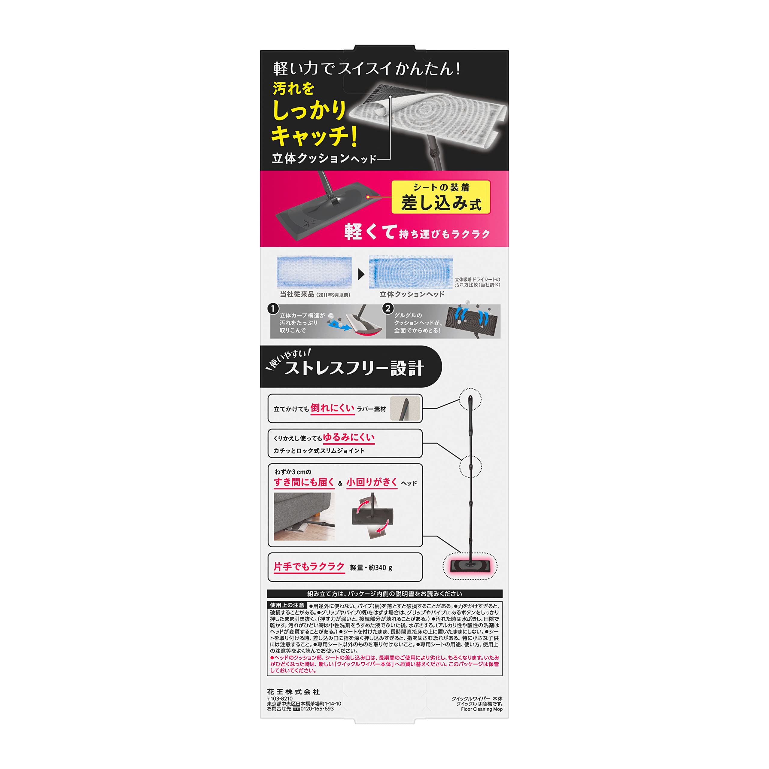 セット内容 ●クイックルワイパー本体 (グリップ:1本、パイプ(柄):3本、ヘッド:1個) ●立体吸着ウエットシート STRONG 〈香りが残らないタイプ〉:1枚