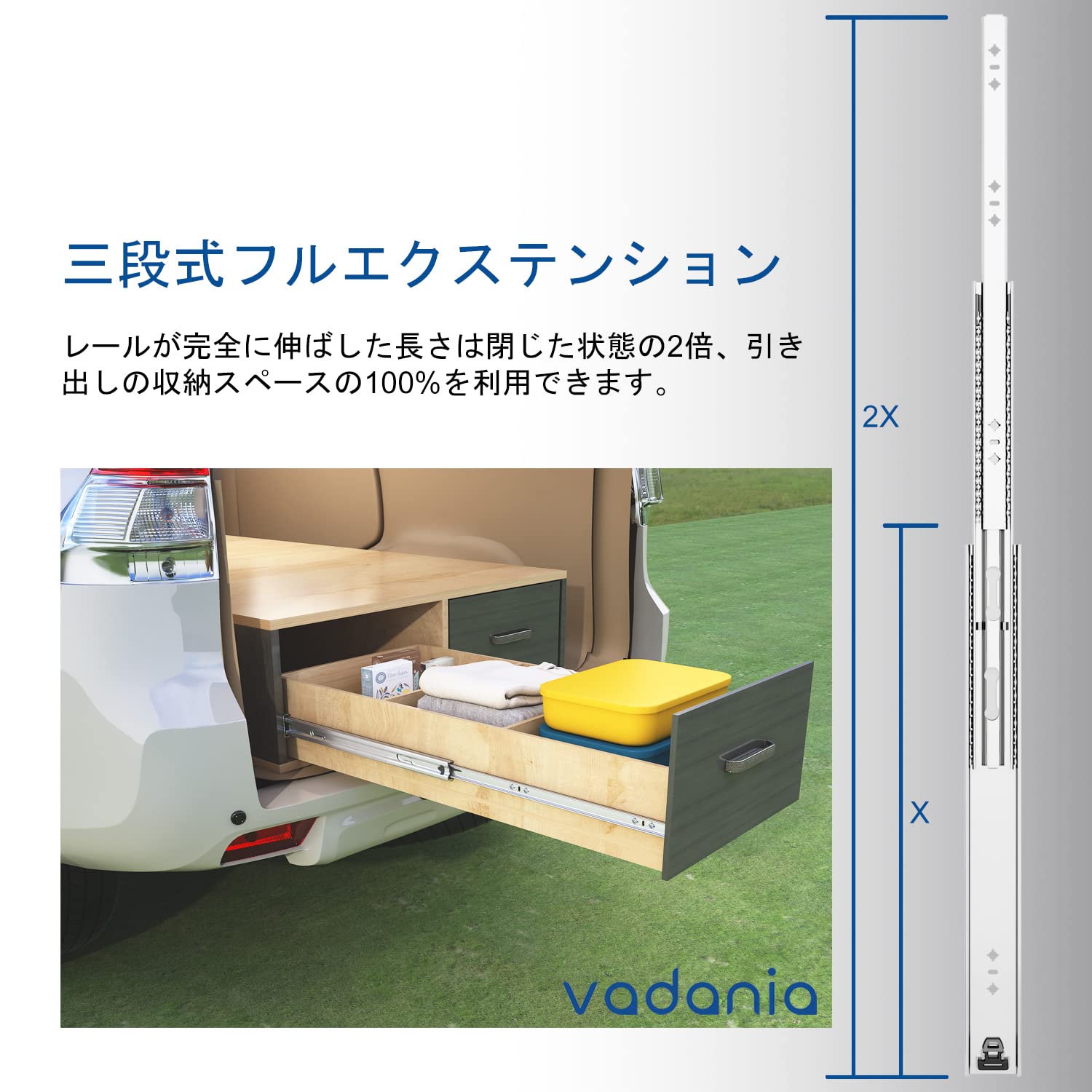 フルエクステンションで完全アクセス: 3段式フルエクステンション設計により、引き出しを100%完全に引き出せます。奥の物も手前の物もストレスなく、全体を簡単に確認・取り出し可能。無駄なスペースがありません。