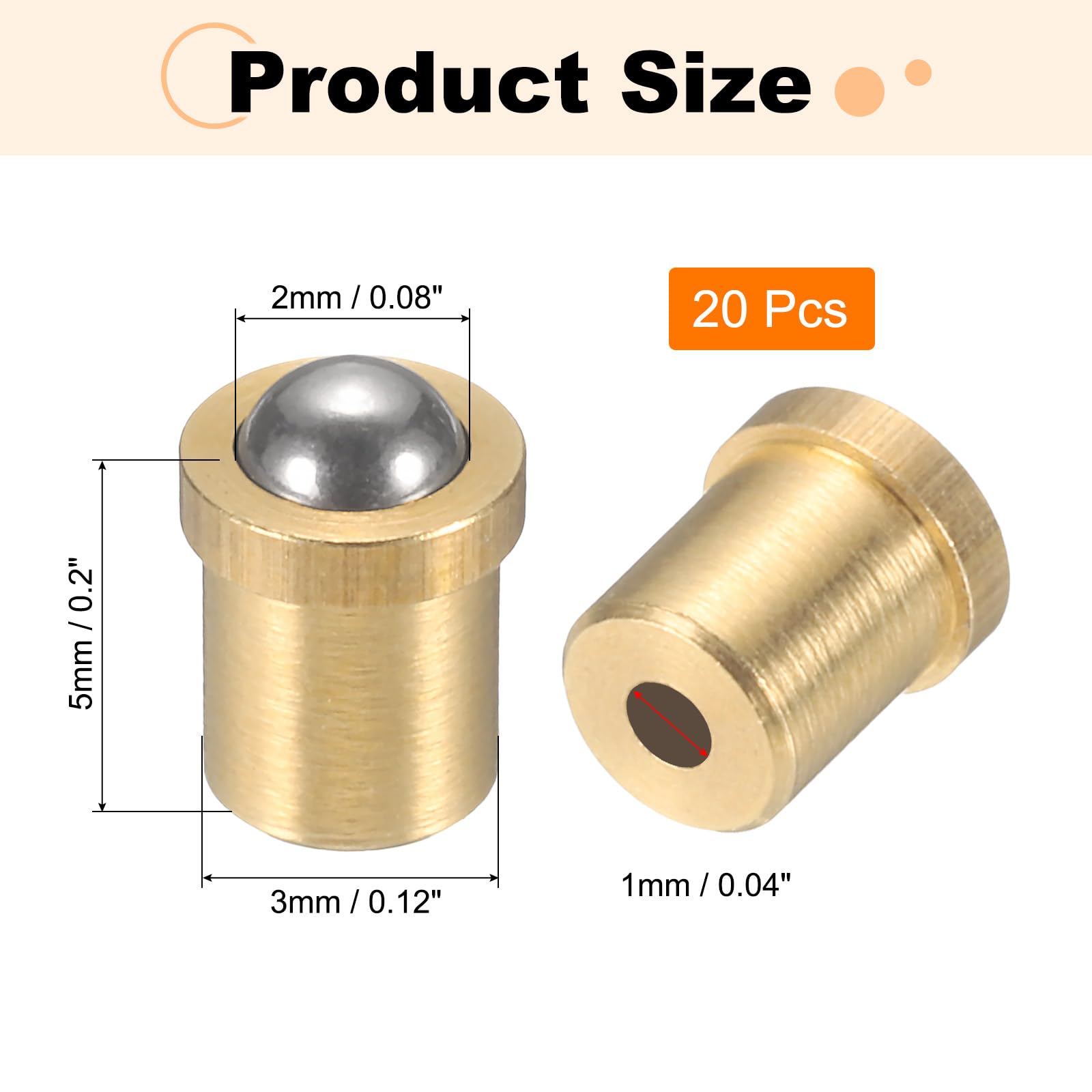 [仕様]サイズ:2×3×5mm(ボール直径×シリンダー直径×シリンダー長さ)。口径: 1mm。エンドフォース: 5N。ボール素材:304ステンレス鋼;シリンダー素材:真鍮。パッケージ内容:20個 × ボールプランジャー。タイプ:押し込む。