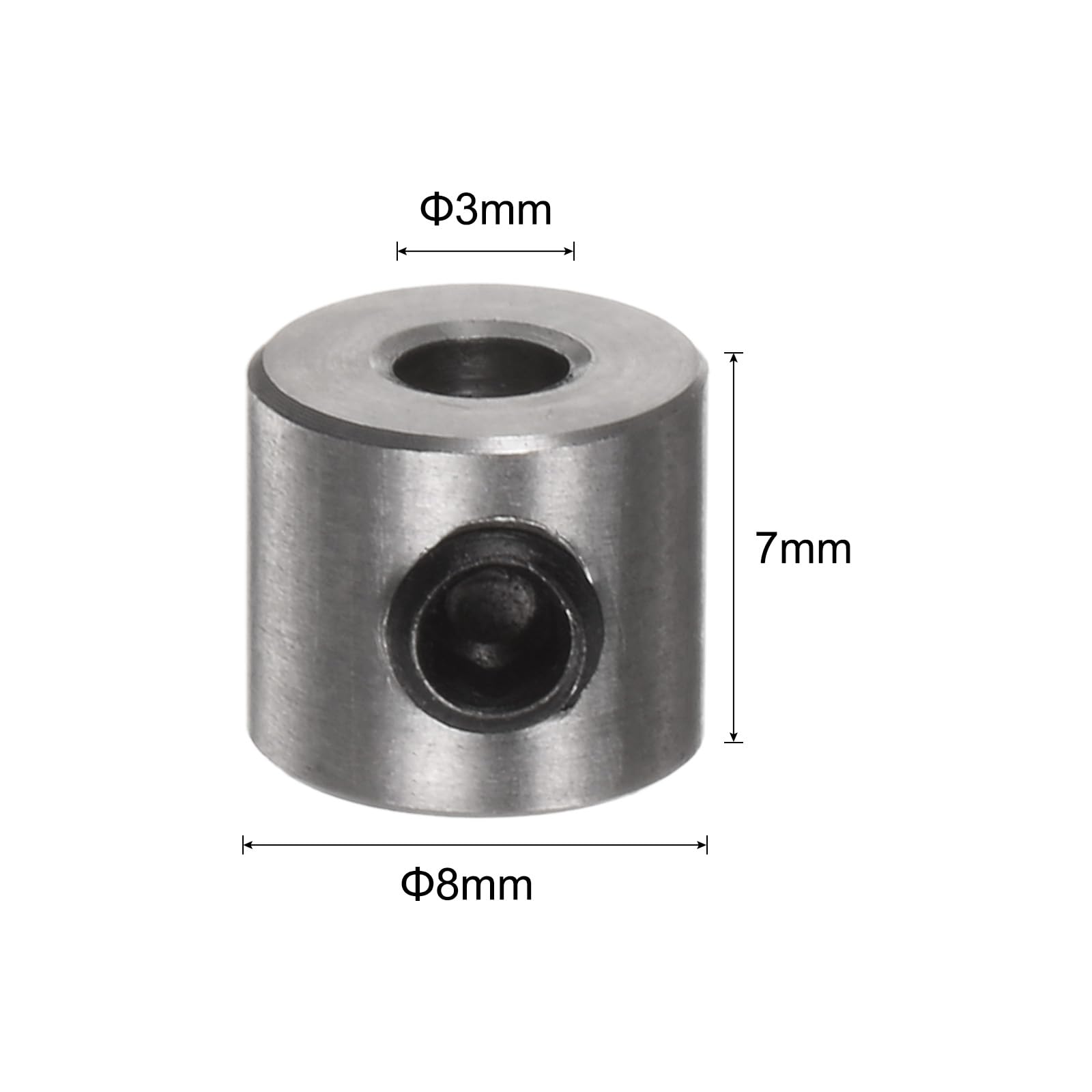 サイズ - セットスクリュー付きの3 mmシャフトカラー、外径8mm、厚さ7mm。