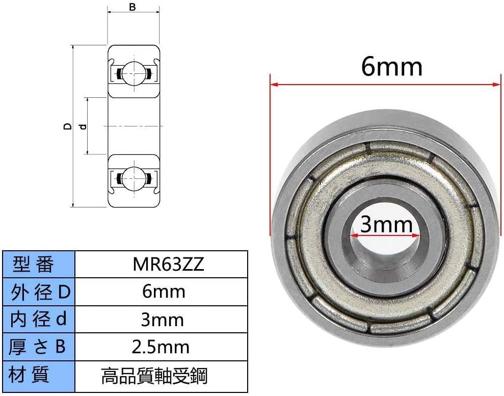 ミニベアリング MR63ZZ(630ZZ) 12個セット 内径3mm×外径6mm×幅2.5mm 両面メタルシールド 材質:軸受鋼 リール改造やメンテナンスに使用されています。 ミニ四駆、電動リール,等の自作、修理に最適です。