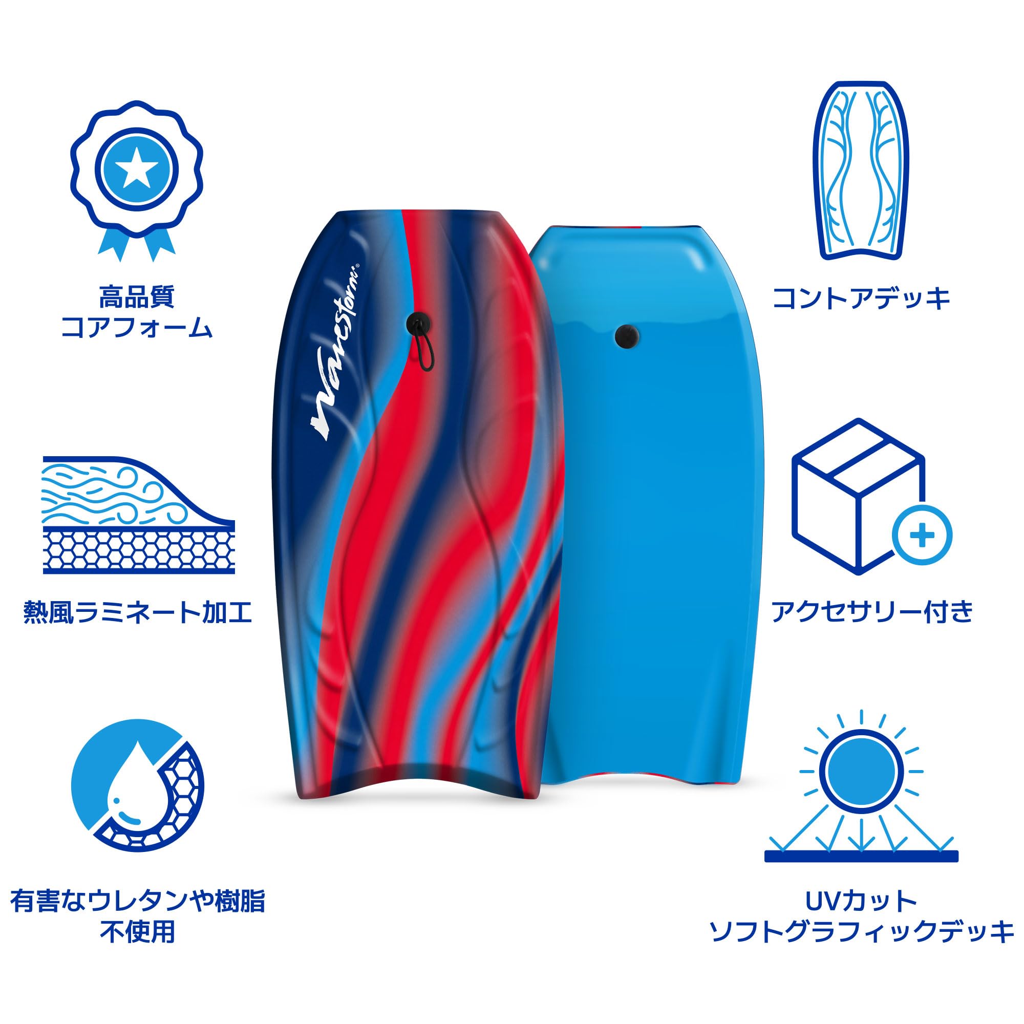 Wavestormのボディボードは長さ40インチで、海、湖、プールでのレクリエーションの楽しみに最適です。若者や大人に十分な大きさです。高品質の特許取得済みの素材と職人技で作られています。 各フォームボディボードは軽量で丈夫です。 優れた拡張フォームコアと滑らかなHDPE(高密度ポリエチレン)の滑らかな底面により、さらなる剛性、スピード、反動を実現。 各ボードは細部にまで注意を払うために細心の注意を払って作られています。UV抑制特許取得済みのカラーデッキスキンが成形された輪郭デッキの上に施され、走行中の重要なエリアでのグリップを向上させます。 Wavestormのサーフィンボディボードはすべて熱風ラミネート加工で、建設中に有害な接着剤やエポキシを使用していません。 各ボディボードには、ライダーをボードに固定するのに役立つ基本的なリストリーシュが含まれています。 各ボードは、Wavestormの品質をして作られています。欠陥があると思われる材料はすべての対象となり、お客様の満足が最も重要です。 製品に関するご質問や懸念事項にはすぐにお答えいたします。Wavestormをお選びいただきありがとうございます。
