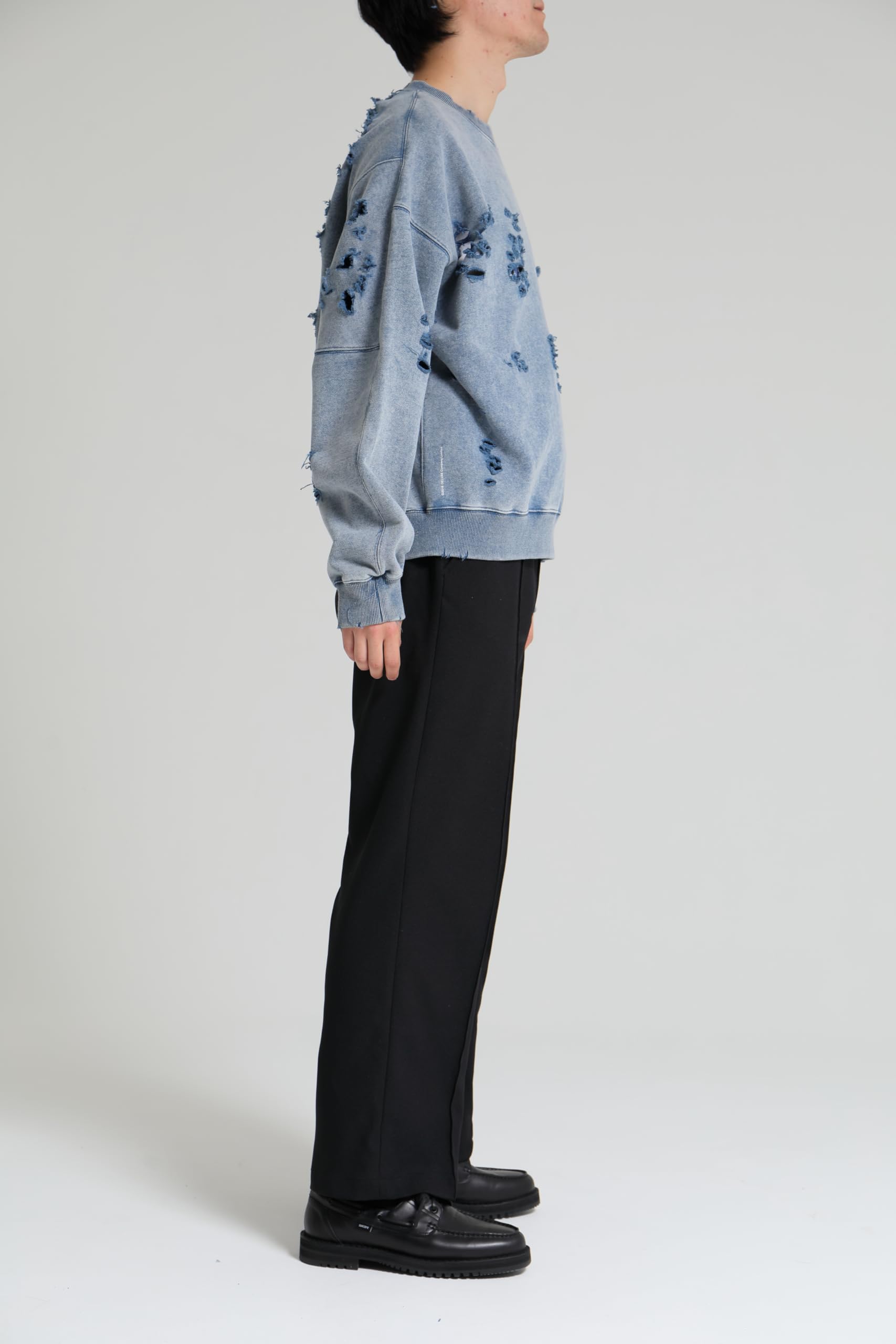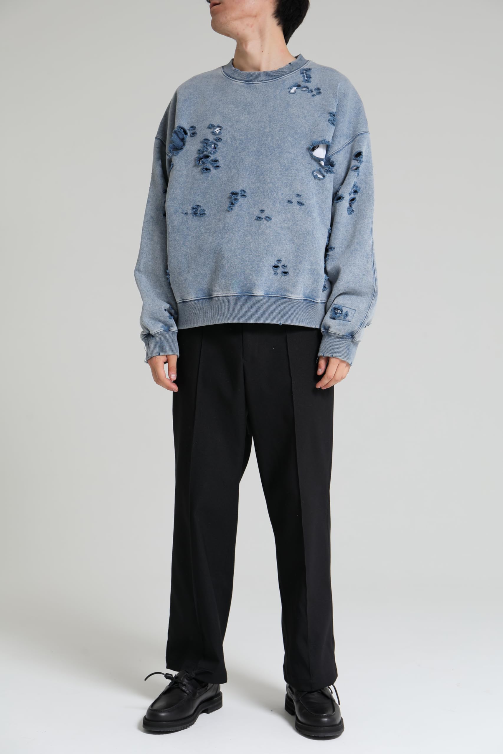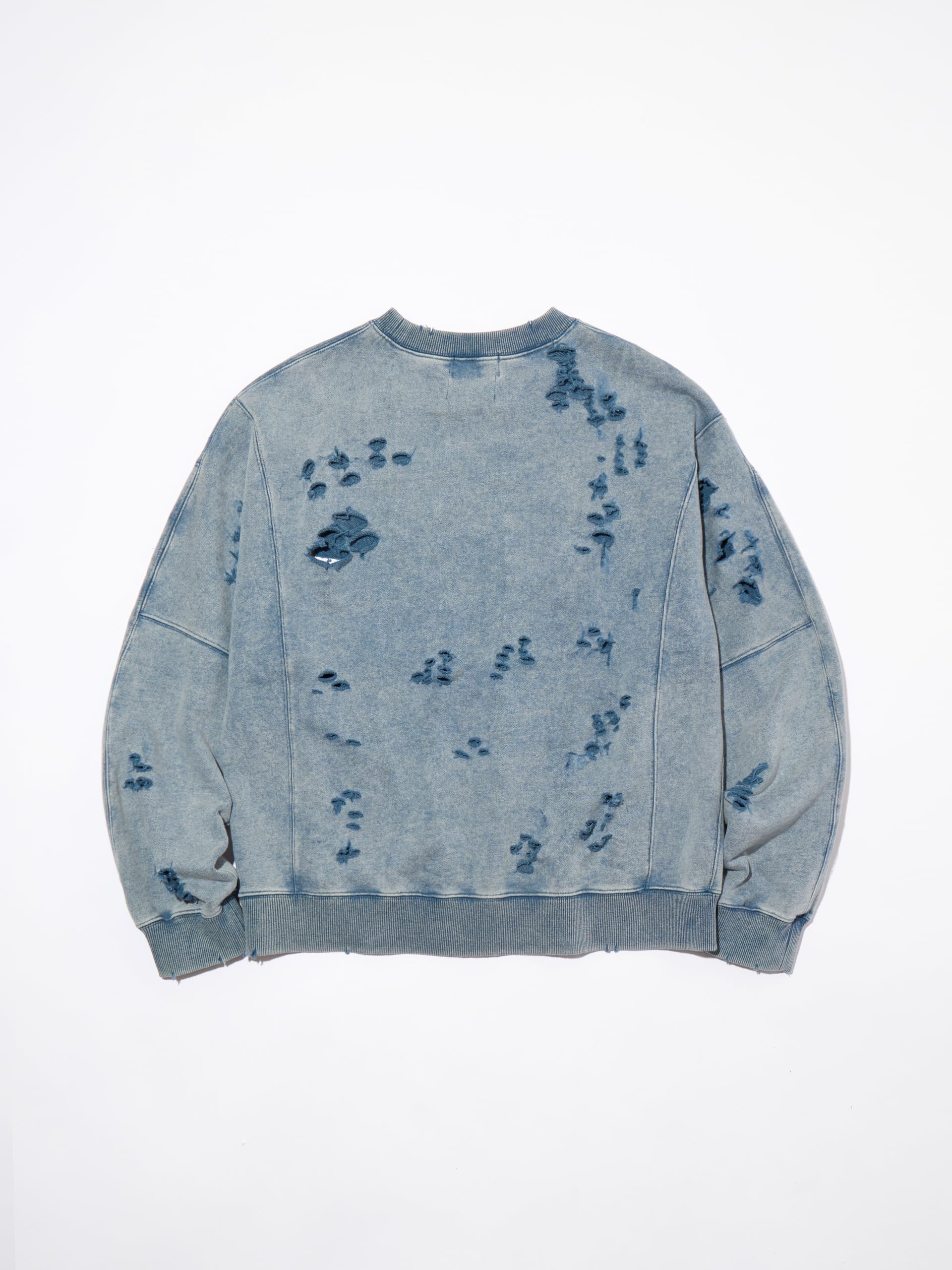 【ブランド説明】 『ブランドが誕生して以来、DELUXEは様々なタームを迎えては変化し、成長を続けてきた。テーラリングやハイストリートといった価値観の融合。そして時代とともに加速するファッションシーンの移ろい。そんな中でDELUXEは自身のルーツである世界各地のストリートカルチャーと、それを雑多に飲み込んでは洗練を重ねる東京という街を誇りにブランドを育んできた。縫製技術からジッパーひとつまでをも徹底的にこだわる洋服作りへの姿勢。古き良き手法と一新されゆくトレンドをたしかにリンクさせていく温故知新の精神。そうして紡いできたストーリーをもとに、着る者に”本物”をもたらすモノ作りを目指していくブランドであり、ストリートの最上級 = DELUXE を目指します。 【商品説明】 オリジナルで作成した肉厚なコットン裏毛素材を使用したクルーネックスウェットシャツ。身頃全体にピグメント加工・ダメージ加工を施し、ヴィンテージな風合いに仕上げた。左袖のダメージ痕下にブランドロゴ、前身頃右下にコピーライトロゴをラバープリントで配置。身頃の左脇にスクウェア型ネームを叩きつけ。身幅にゆとりのあるシルエット。3色4サイズ展開。