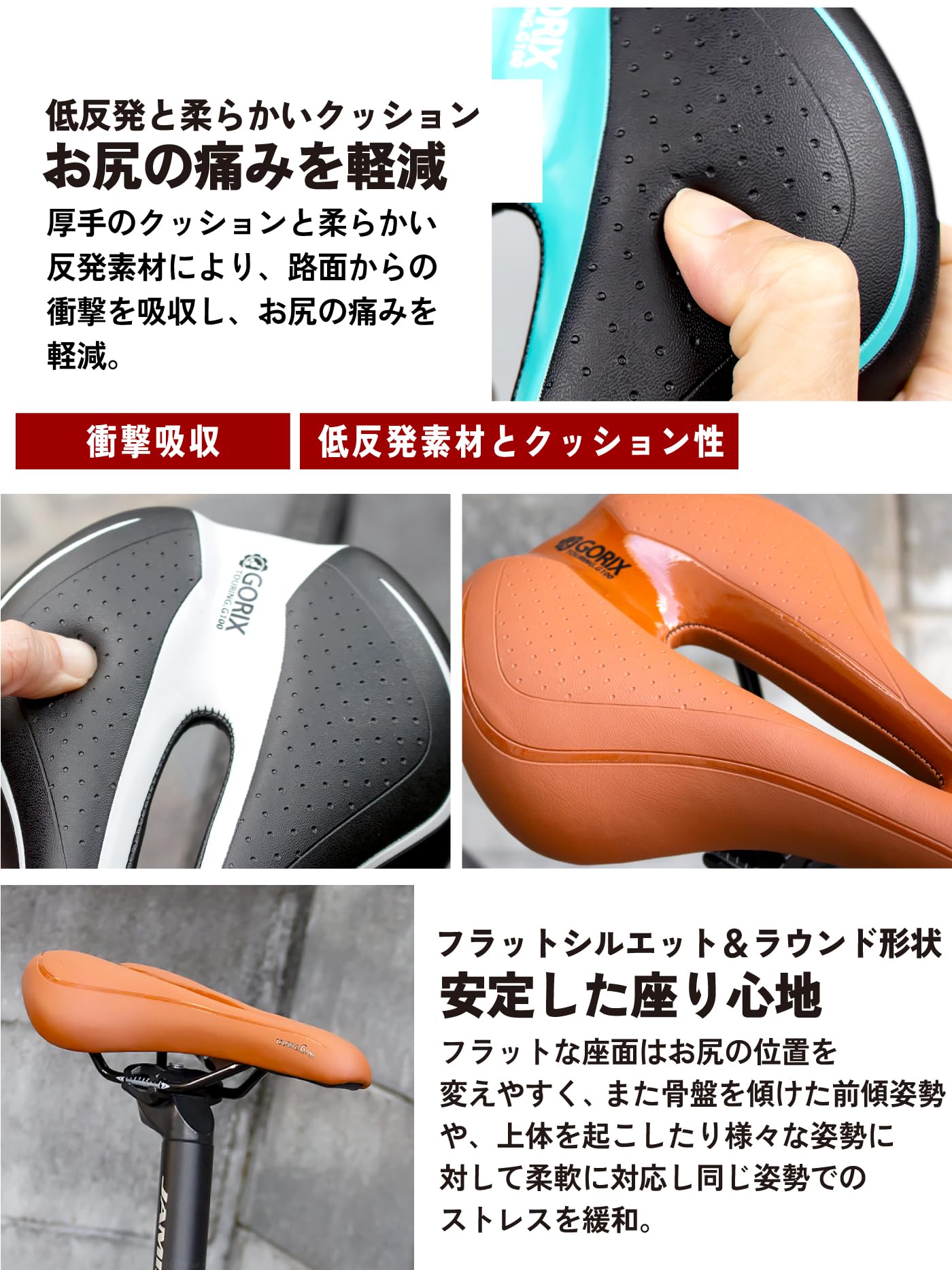 【地面からの衝撃を吸収】バックは大きなラウンド形状なので、安定して長く座れる柔らかい低反発タイプのサドルです。底面以外の厚みは、厚手のクッション素材、張りのある柔らかい反発素材で、身体の重量や衝撃を和らげてお尻の痛みを軽減してくれます。