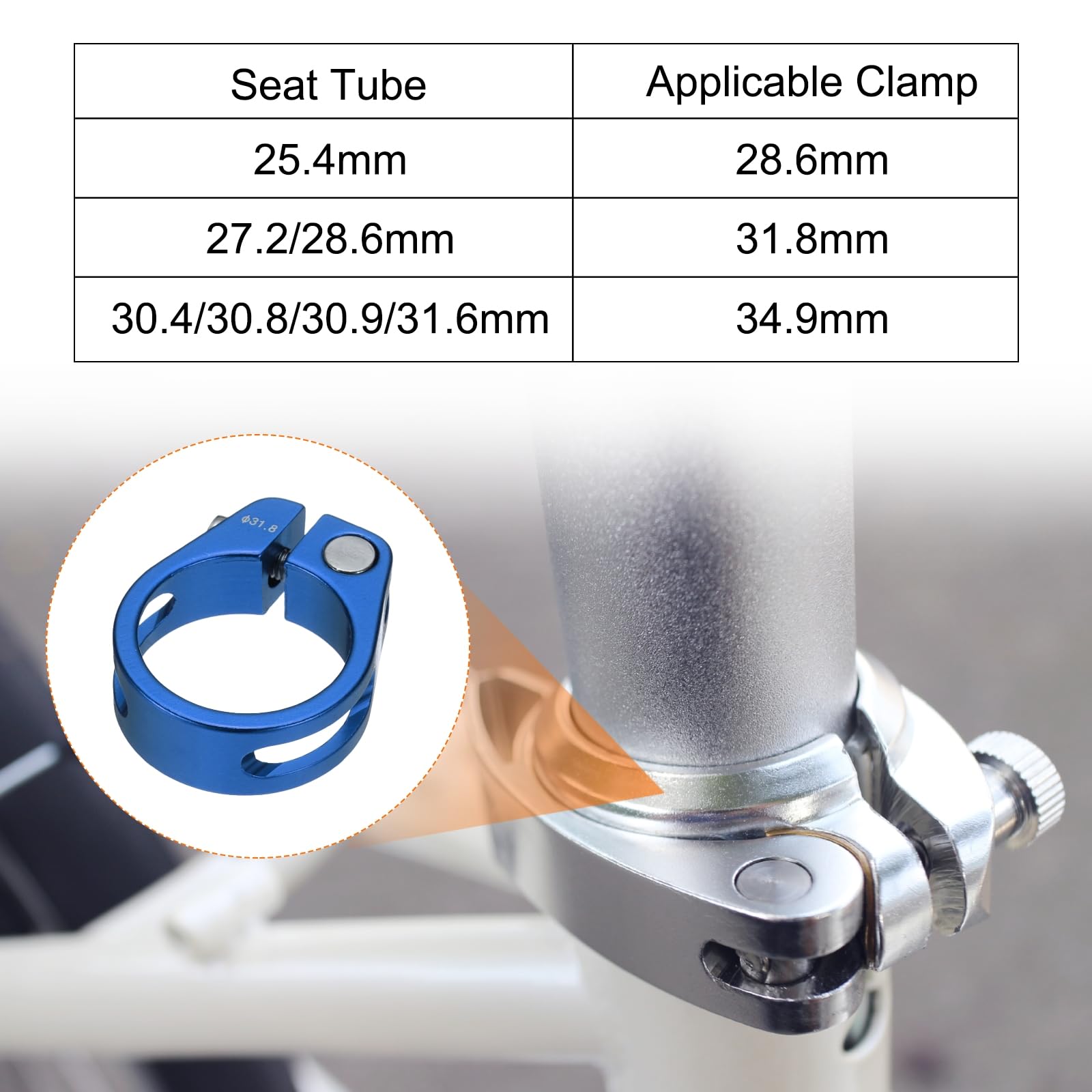 当社のシートポストクランプには3つのサイズがあり、28.6mmクランプは25.4mmのシートポスト直径に適しています。31.8mmクランプは27.2/28.6mmのシートポスト直径に適しています。34.9mmクランプは30.4/30.8/30.9/31.6mmのシートポスト直径に適しています。シートポストクランプを購入する前にシートポストのラベルまたはサイズを確認する必要がありますが、シートチューブの壁の厚さは異なりますので、まずフレームシートチューブの実際の外径を測定し、最終的に適切な自転車シートポストクランプを総合的に選択してください。