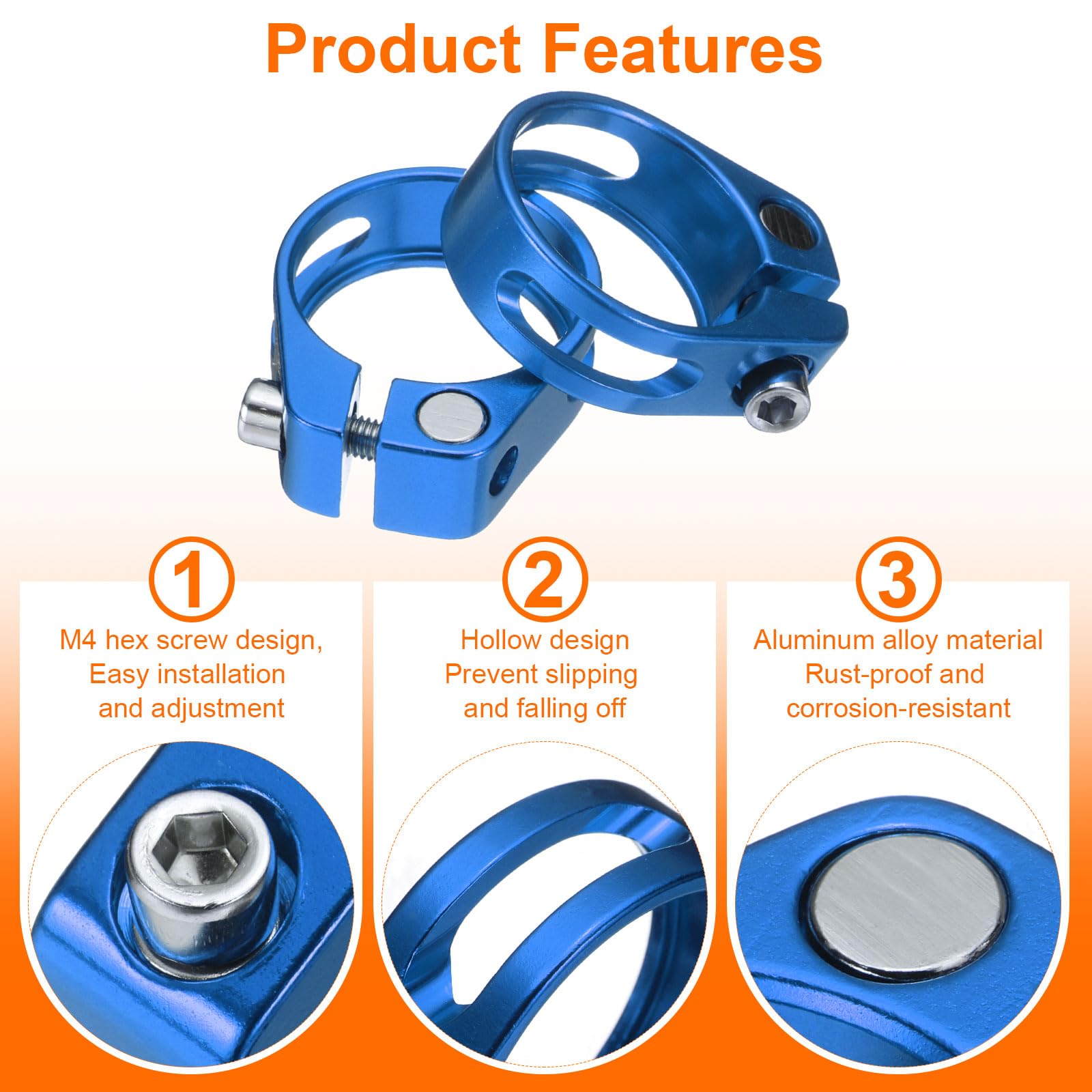 自転車シートポストクランプは簡単に取り付けられ、4mm六角レンチで締めるだけでシートポストの高さを簡単に調整できます。軽量でありながら耐久性に優れ、頑丈な固定ボルトが二重の頑丈さと安定性を確保し、シートポストにしっかりとフィットし、乗車中のスライドや動きを防ぎ、この信頼性の高いクランプを使用して安定した快適な乗り心地を楽しむことができます。