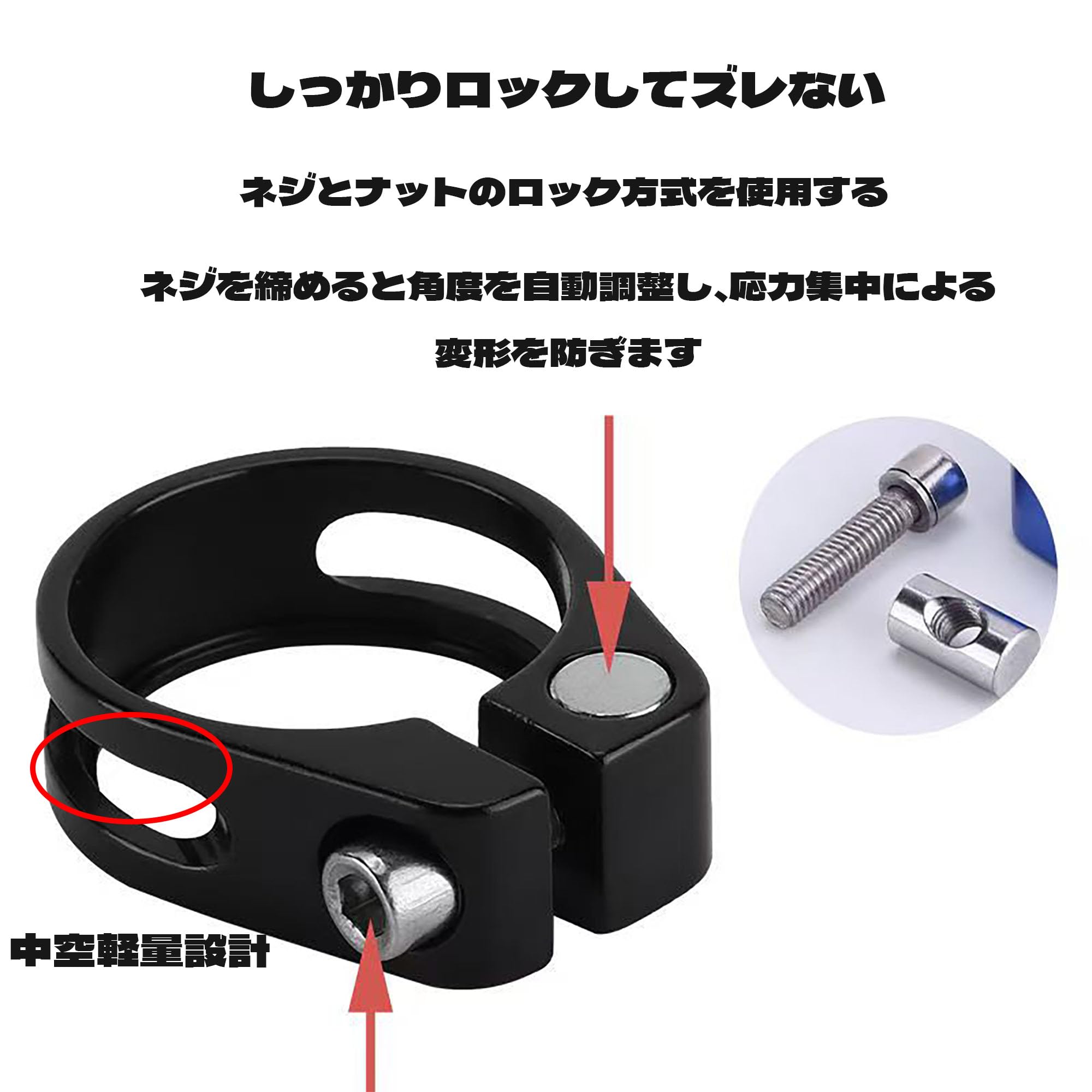 【優れた固定力】ねじとナットがしっかりと固定され、滑り落ちることはありません。初心者でも使いやすく、非常に軽量ながら、ロードバイクのシートポストをしっかりと固定します。優れた締結力を提供します。