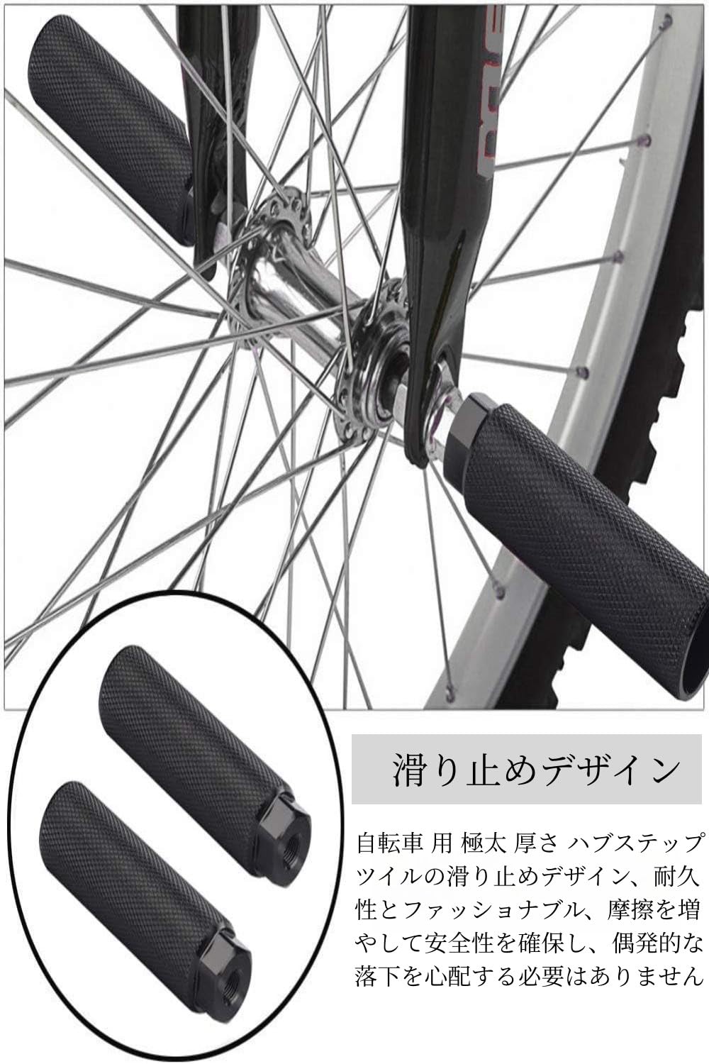 【優れた設計】自転車 用 極太 厚さ ハブステップ ツイルの滑り止めデザイン、自転車ペグの表面には、間隔を空けて固い滑り止めストリップがはめ込まれています。摩擦を増やして安全性を確保し、偶発的な落下を心配する必要はありません。