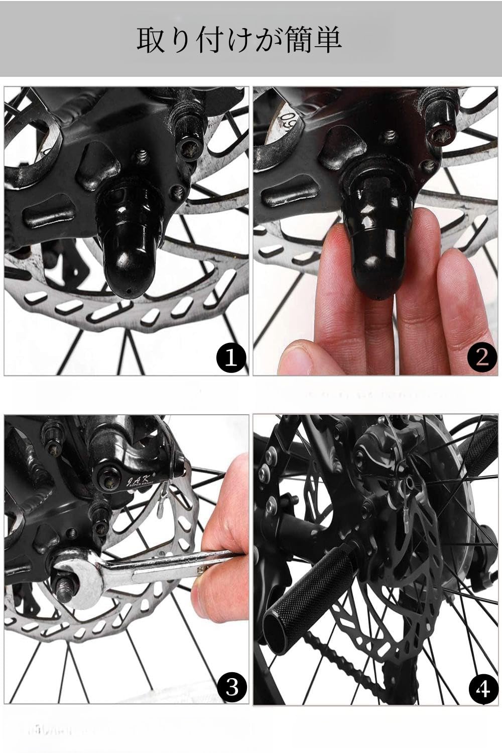 【使い勝手がよい】自転車の前輪または後輪の車軸に簡単に取り付けることができ、自転車の車軸の長さが短すぎる場合は シャフトのネジを外してから、より安全なシャフトにペグを取り付ける必要があります。