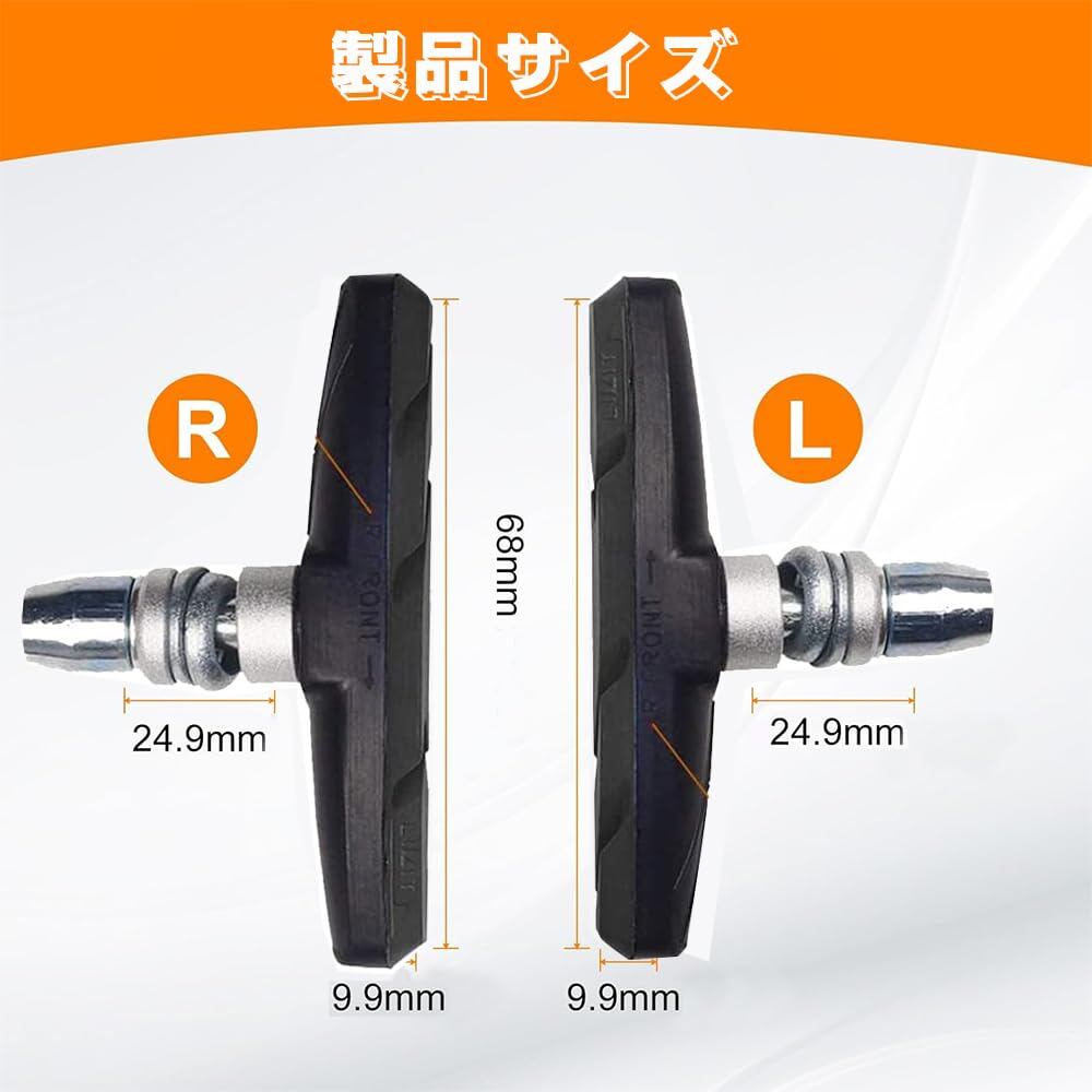 ブレーキシュー 4個セット Vブレーキ 全天候型 70mm 消音 安全 耐久 ブレーキパッド 自転車 マウンテンバイクロードバイク用 左右別設計 簡単取り付け 六角レンチ付き