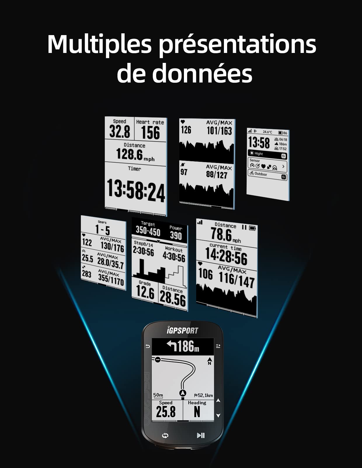 GPS:GPS+Beidou+Glonass+Galileo+QZSS(フルGNSS) スクリーン:2.5インチ強化ガラススクリーン 本体サイズ:82×53×14.5mm 重量:67g データ表示機能:140のサイクリングデータを表示可能(1ページあたり最大8項目・8ページ表示) 言語:多言語対応 バッテリー:充電式リチウムイオン電池内蔵 バッテリーライフ:約30時間 データストレージ:400時間 ルートナビゲーション機能あり(マップ表示なし) 防水・防曇性能:IPX7 ANT+/Blutoothセンサー通信:ハートレートモニター、スピードセンサー、ケイデンスセンサー、ケイデンス&スピード一体センサー、パワーメーター(ANT+のみ対応)、スマートトレーナー接続、ジャイロスコープ内蔵動作検出機能 インターフェース:Type-C USB ワイヤレス伝送:Bluetooth 5.0 スマートフォンのiGPSPORTアプリとBLEで接続することができます ストラップホールあり