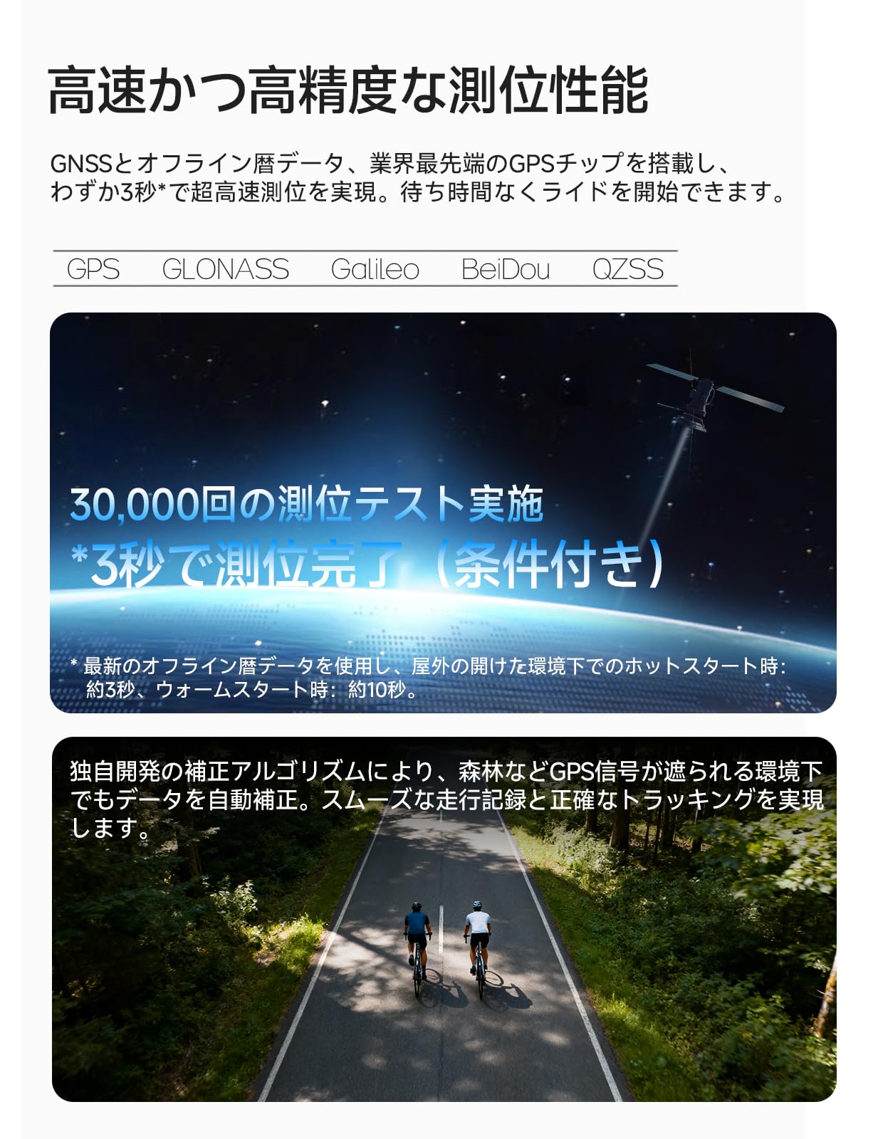 【超薄ボディ|軽量&スリムな新体験】流線型のデザインを採用し、厚さわずか12.7mmの超薄型ボディを実現。業界でもトップクラスの軽さを誇ります。BSC100MAXサイクルコンピューターは、ロードバイクにもマウンテンバイクにも美しく調和し、エアロダイナミクスとテクノロジー感を兼ね備えたデザインです。