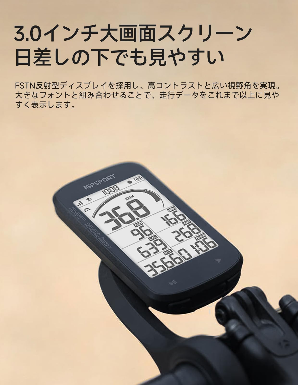 【超大型ディスプレイ|3.0インチ表示で日差しの下でも見やすい】BSC100MAXサイコンは、FSTN半透過・半反射型ディスプレイを採用。広い視野角と高コントラストを実現しました。強い日差しの中でも視認性が高く、大きなフォントの画面デザインにより、直射日光下でもデータをはっきり確認できます。