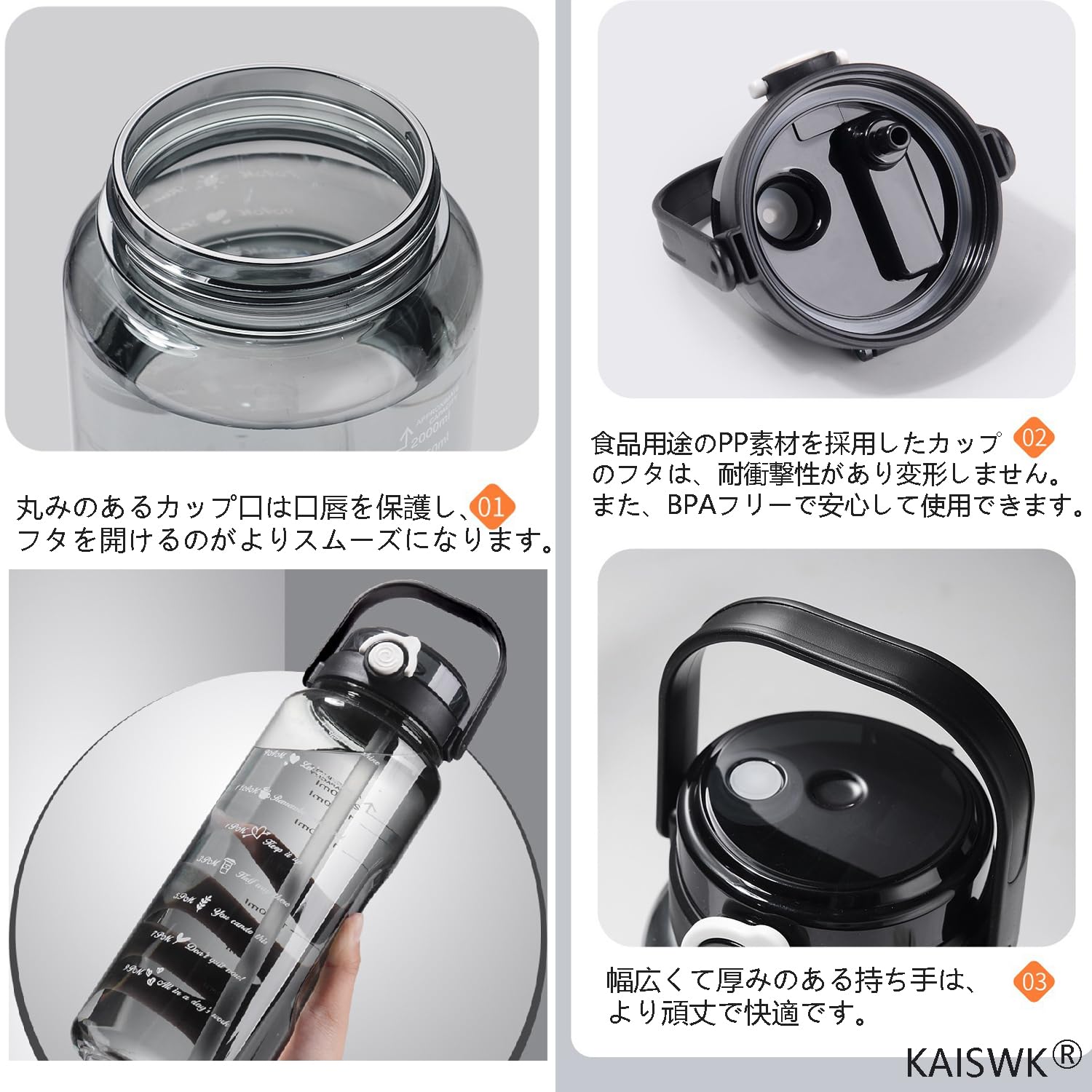 [素材説明] この製品は、BPAや有害なフタル酸エステルを含まず、食品衛生基準に適合したのPC、PP素材を使用しています。人体に無害であり、飲み物の味を損ねません。