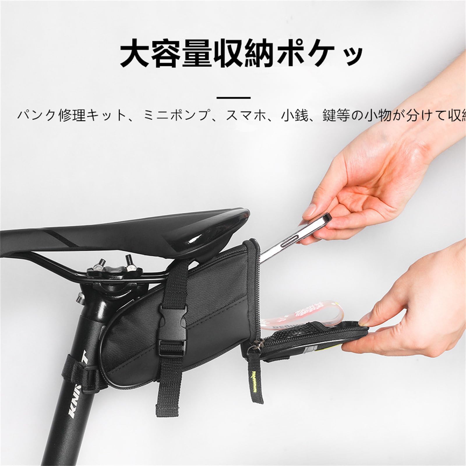 [収納容量]Co2タイプの空気入れやチューブ、パッチキット、工具などを収納できる。大きすぎず小さすぎず丁度いいサイズです。[小物収納に最適なサブポケット]小さいアイテムが奥の方に入って取りにくい…そのような事も解決![型崩れしない]PP板入れ、常に形を保ち綺麗な形状を維持します。[様々な自転車に取付可能]ロードバイクやクロスバイク、MTB、折畳自転車、ミニベロなど