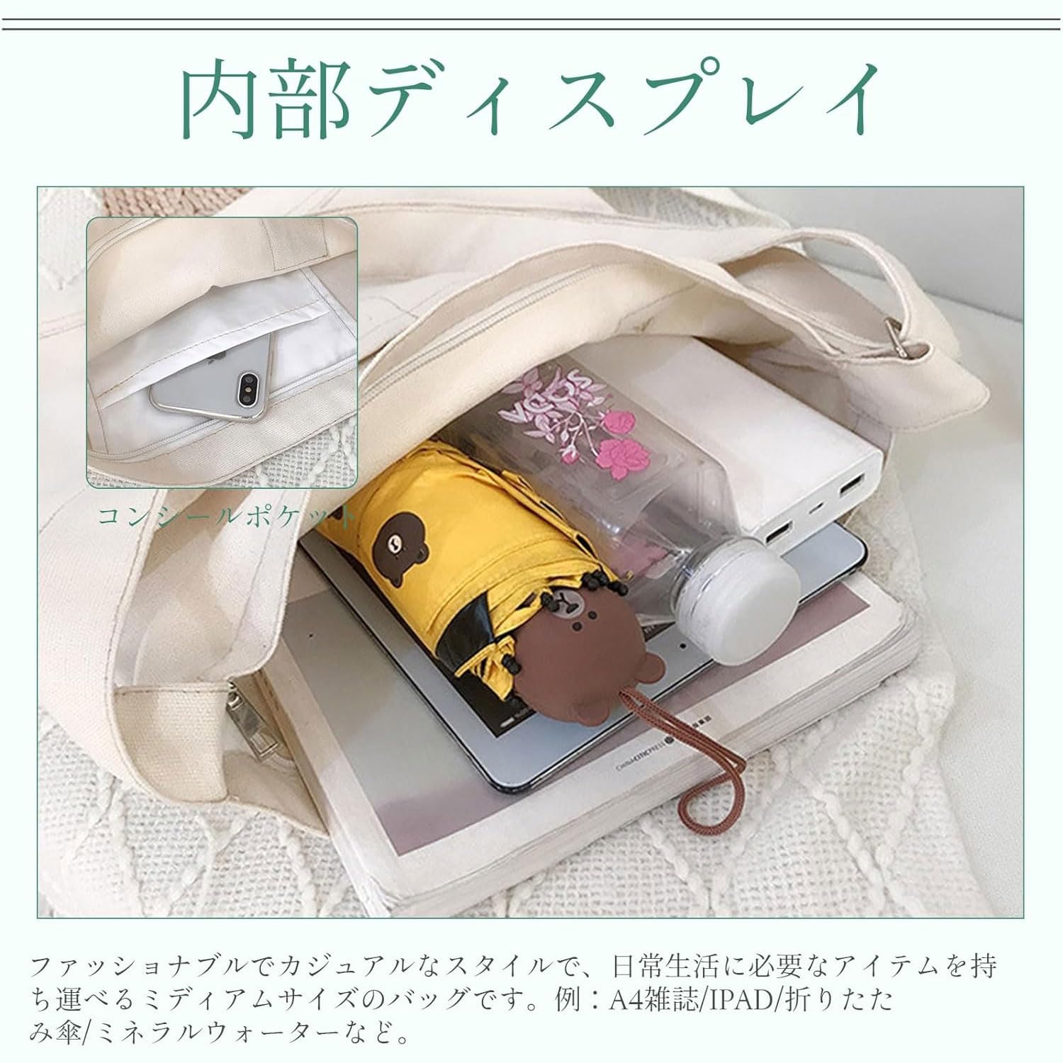【容量】A雑誌4冊、B傘5本、ペットボトル、化粧品など楽に収納できます。1〜2泊の旅行バッグ、ジムバッグ、友人や家族とのピクニック、通勤、通学、子供とのお出かけに使えます。適したサイズ。