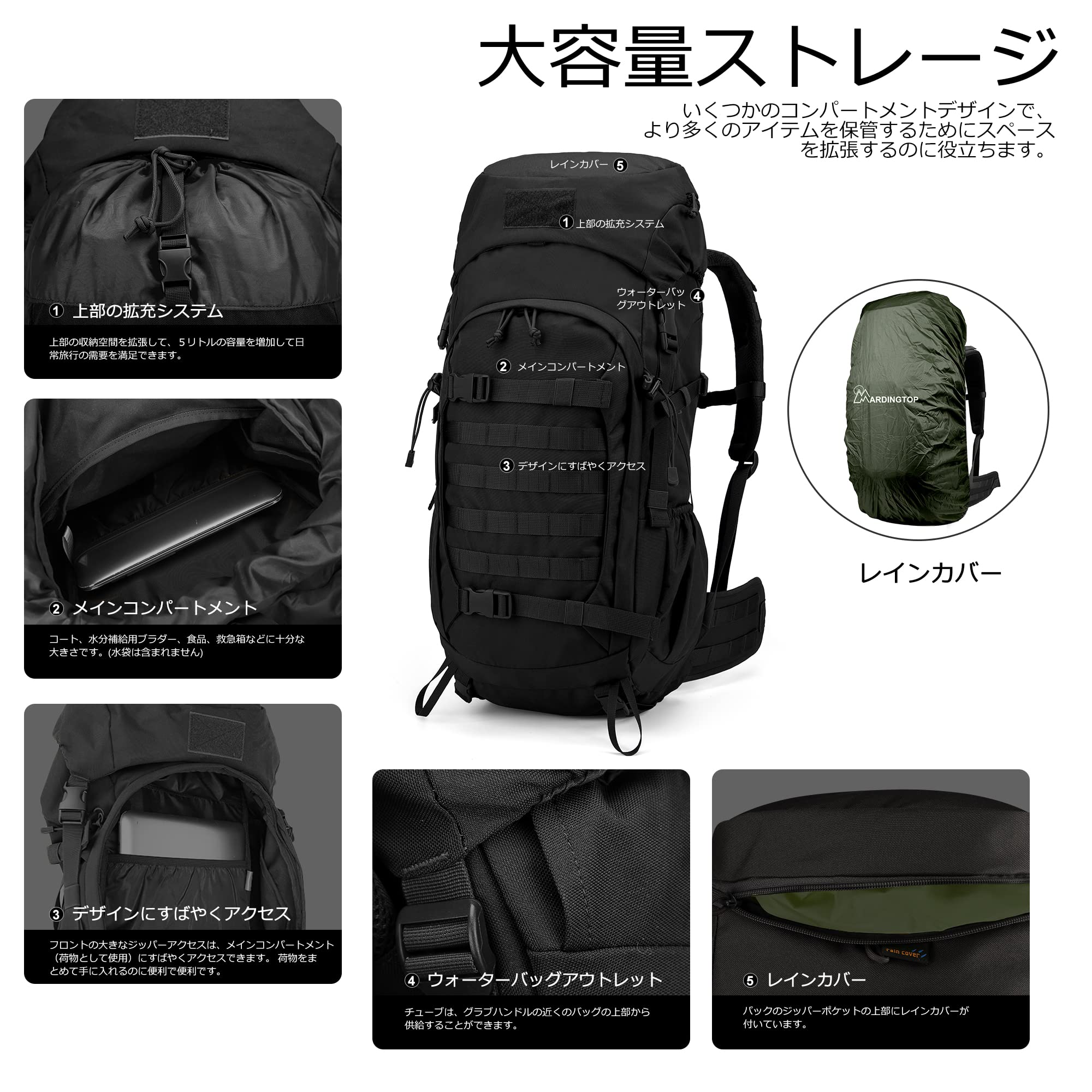 [Mardingtop] 50L バックパック 大容量 レインカバー付 タクティカルリュックサック キャンプ 登山 モールシステム ミリタリーリュック 軍用バッグ サバイバル トレッキング 大型 旅行 防災