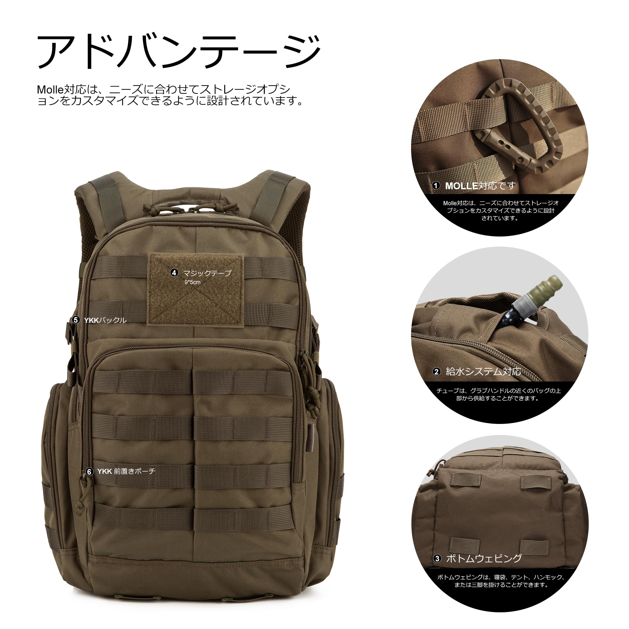 【MOLLE対応です】このリュックサックは、小さなアイテムに掛けたり、追加のポーチやギアを取り付けたりできます。 バックパックには、ベッドロール、テント、またはその他のものをストラップするための4つのmolleフックも下にあります。 サイドポーチはウォーターボトルにフィットします。