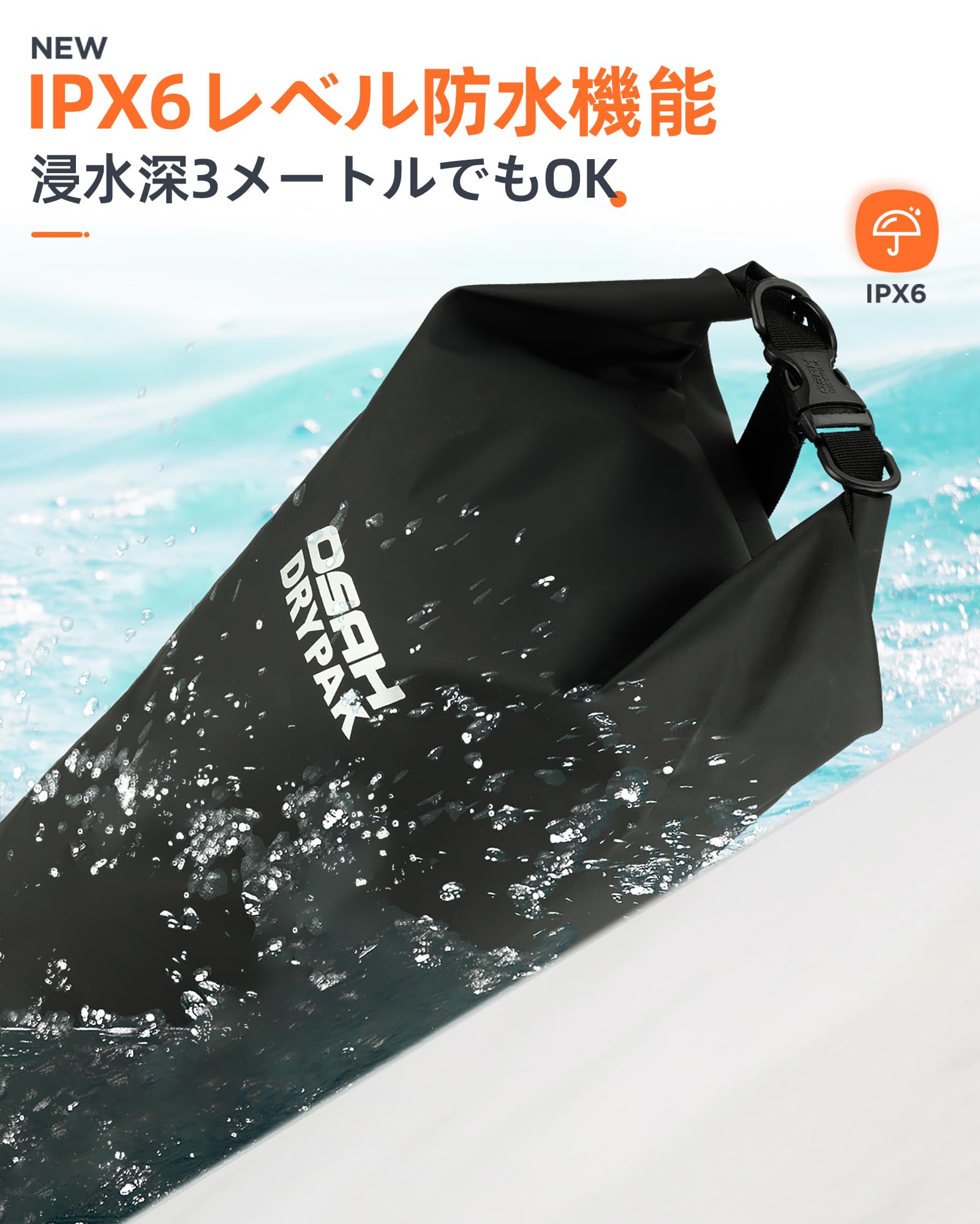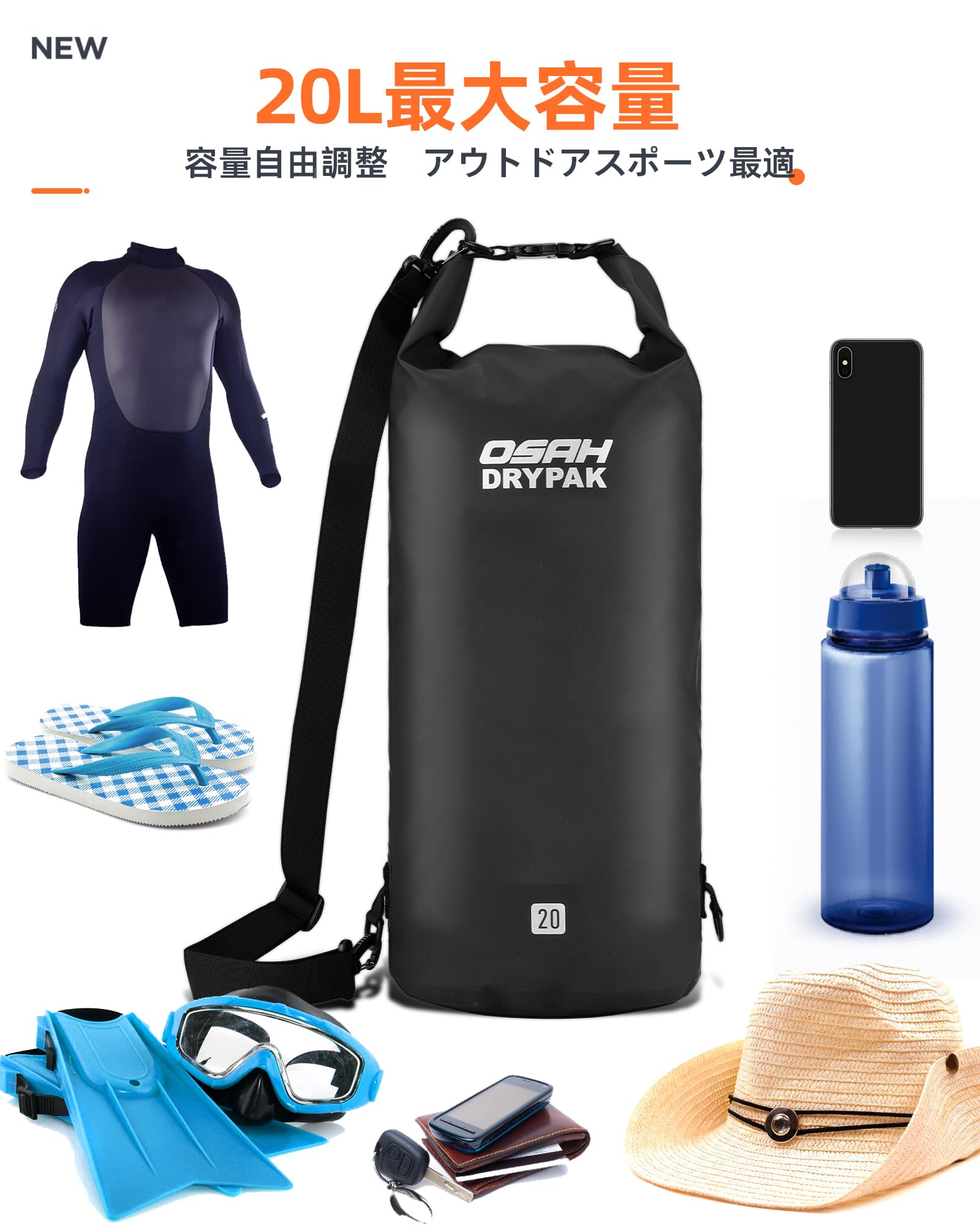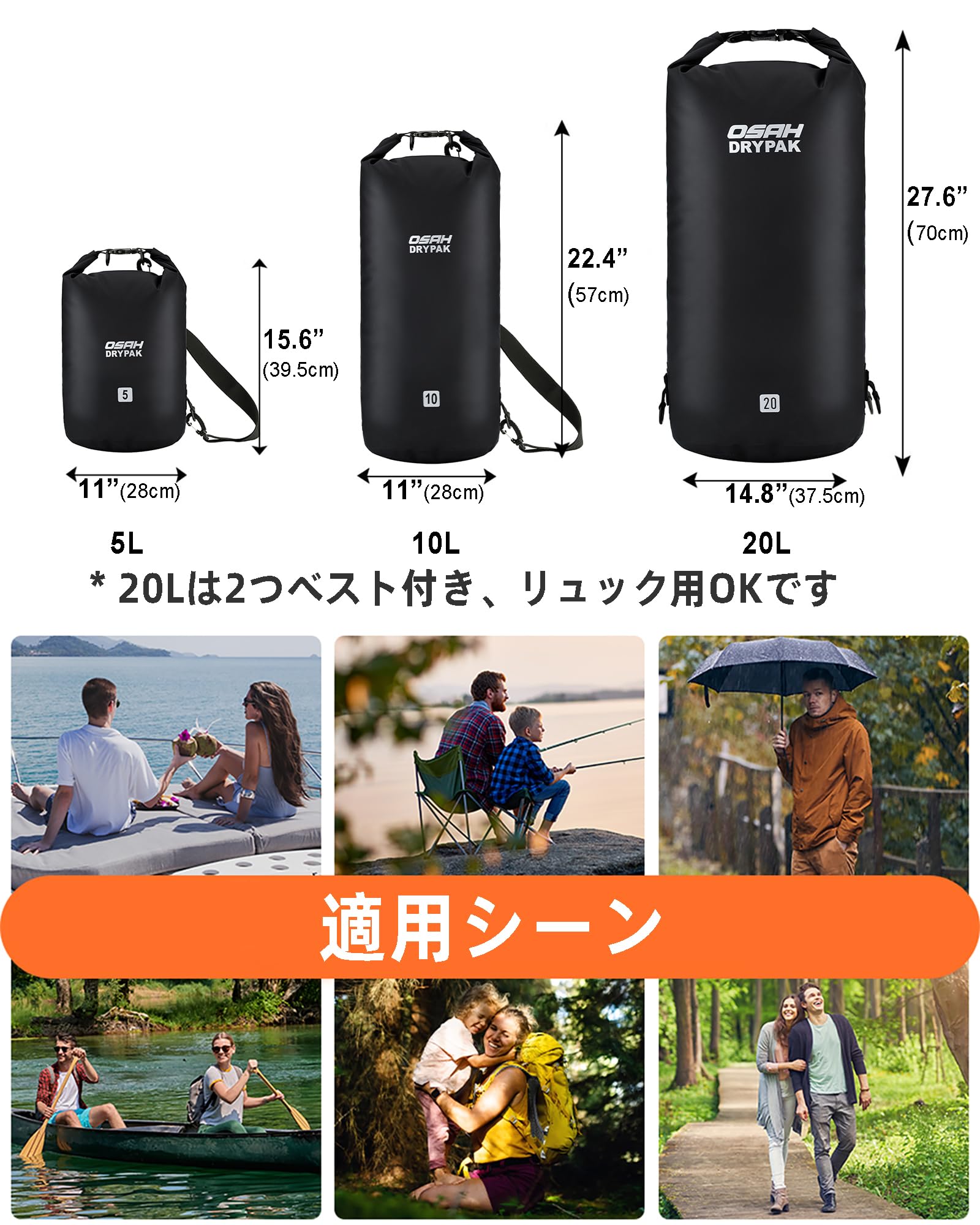 【3サイズ&使用シーン】:お客様のニーズに応じて異なる容量を選択できます。(5L、10L、20L)釣り、海水浴、海遊び、バイク旅行、登山、キャンプ、サーフィン、カヤック、ボート、温泉、ラフティング、水泳、スノーボードなど、さまざまなアウトストア活動に適用します。(ダイビングなどの長時間の潜水活動には使用できません)