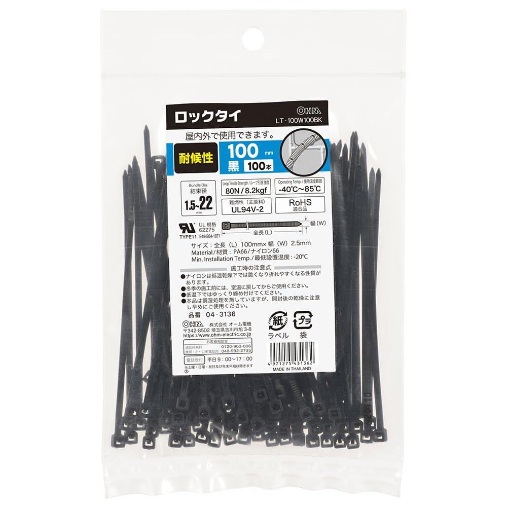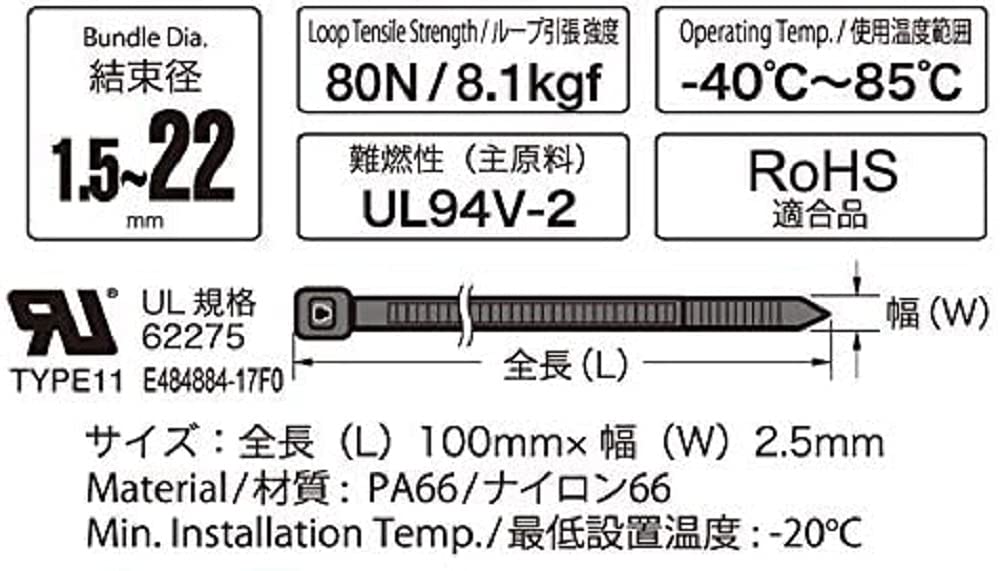 ■ 難燃性(主原料):UL94V-2 ■ RoHS適合品 ■ サイズ:全長100mm×幅2.5mm ■ 100本入り ■ 材質:PA66/ナイロン66 ■ 最低設置温度:-20℃